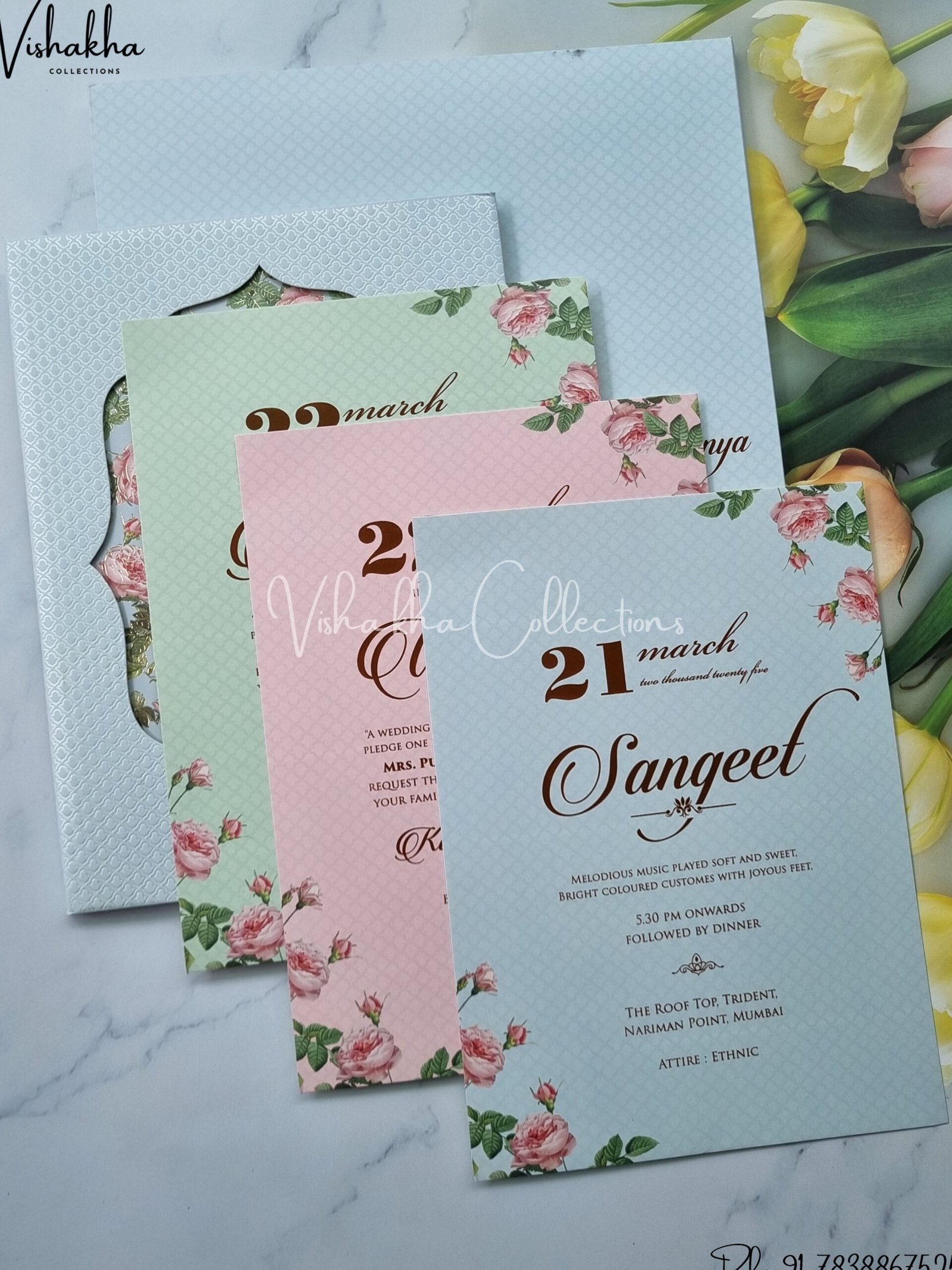 Vishakha Collections presents you beautiful luxury wedding invitation cards with all latest designs and the latest variety. Its just not a wedding invitation card but a beautiful feeling of love and relationship it carries for you. Beautifully printed and packed with a bundle of love. if you like it, dont think again, just go for it.If you are worrying about the quality of the product, send your doubts to us. We are here to help you. If you want in wholesale or bulk, dont forget to contact us.