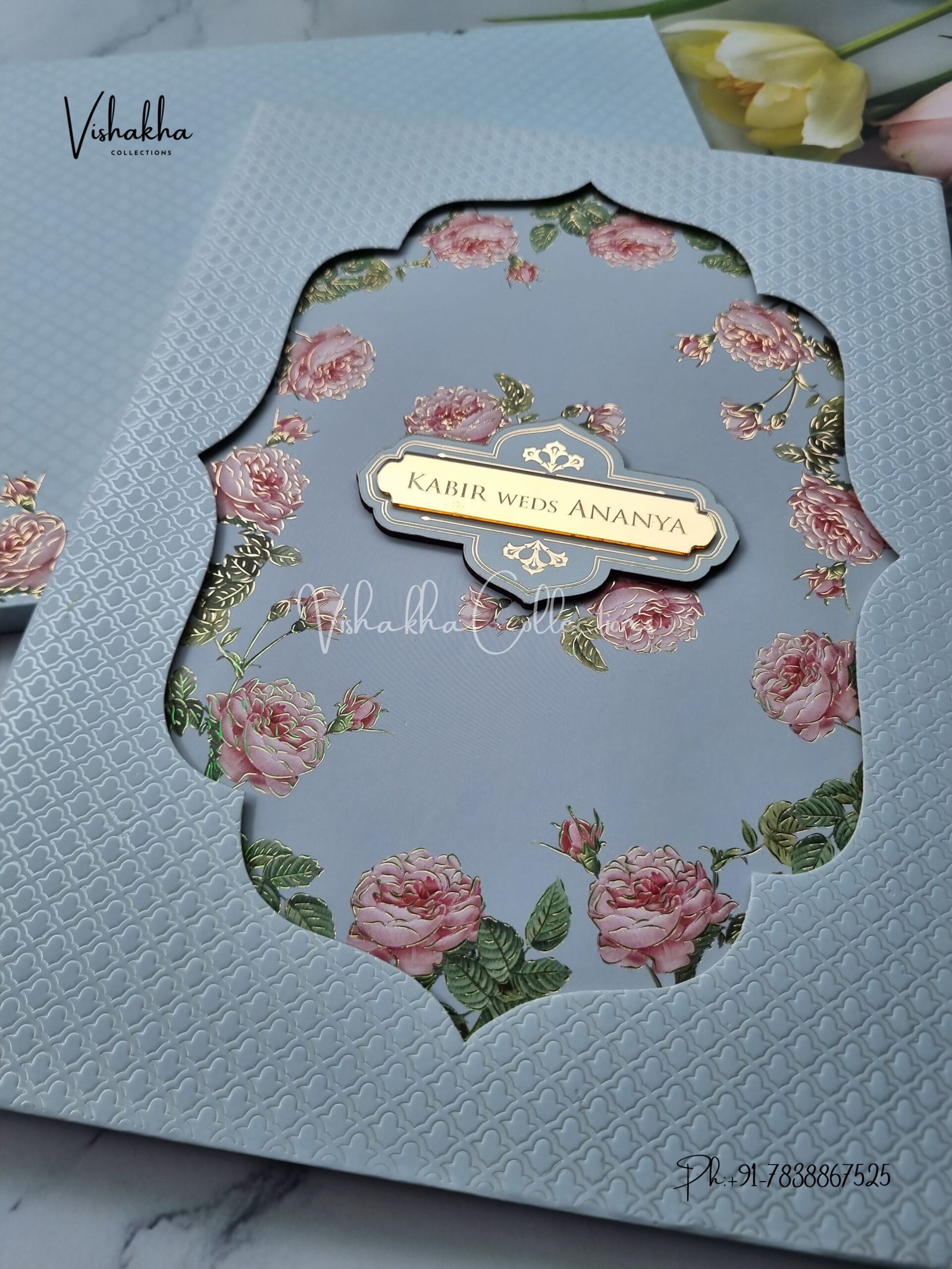 ₹124.00Light blue Floral 3D padded with name plate Wedding Invitation Card SK-3380