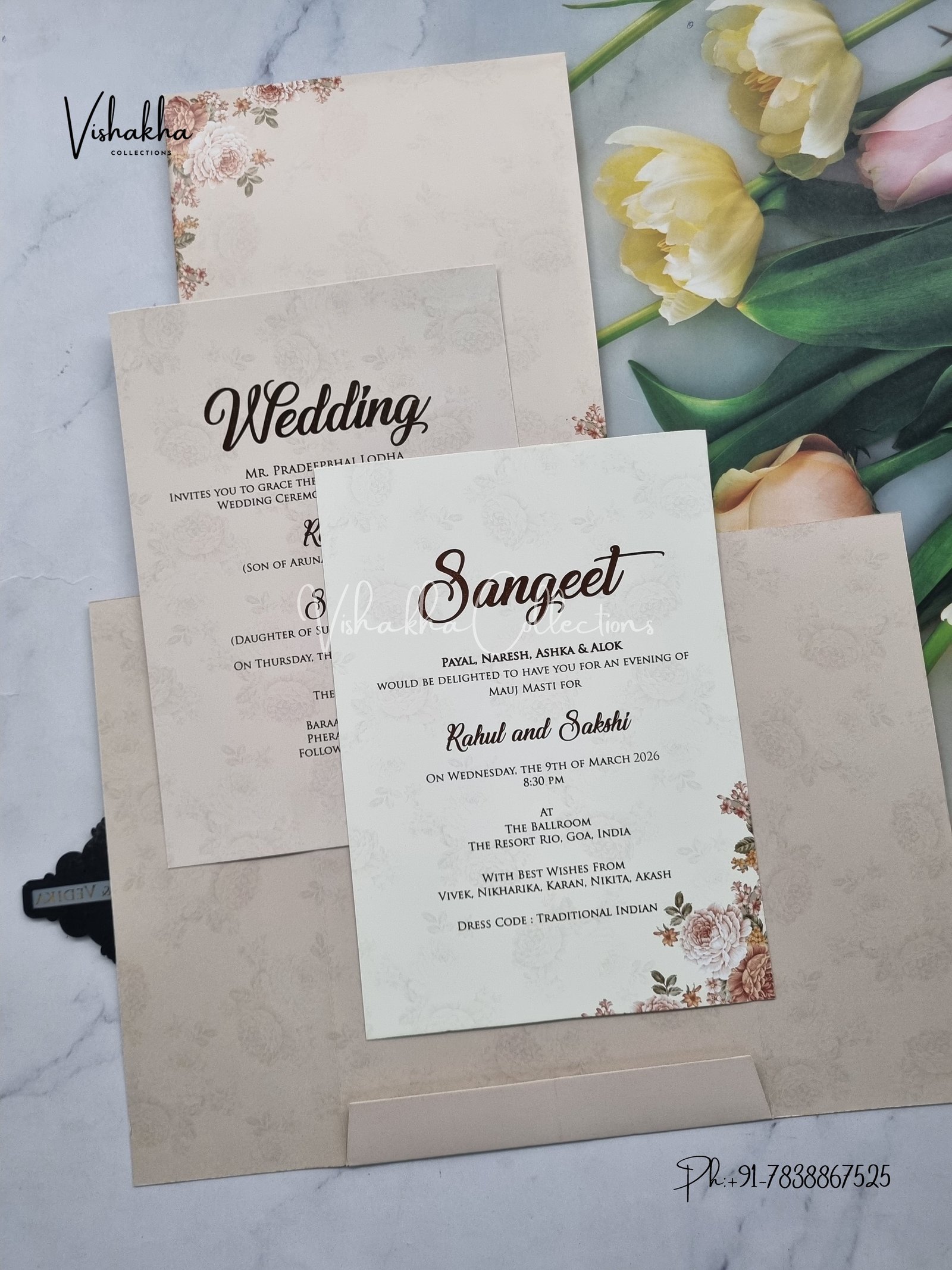Vishakha Collections presents you beautiful luxury wedding invitation cards with all latest designs and the latest variety. Its just not a wedding invitation card but a beautiful feeling of love and relationship it carries for you. Beautifully printed and packed with a bundle of love. if you like it, dont think again, just go for it.If you are worrying about the quality of the product, send your doubts to us. We are here to help you. If you want in wholesale or bulk, dont forget to contact us.