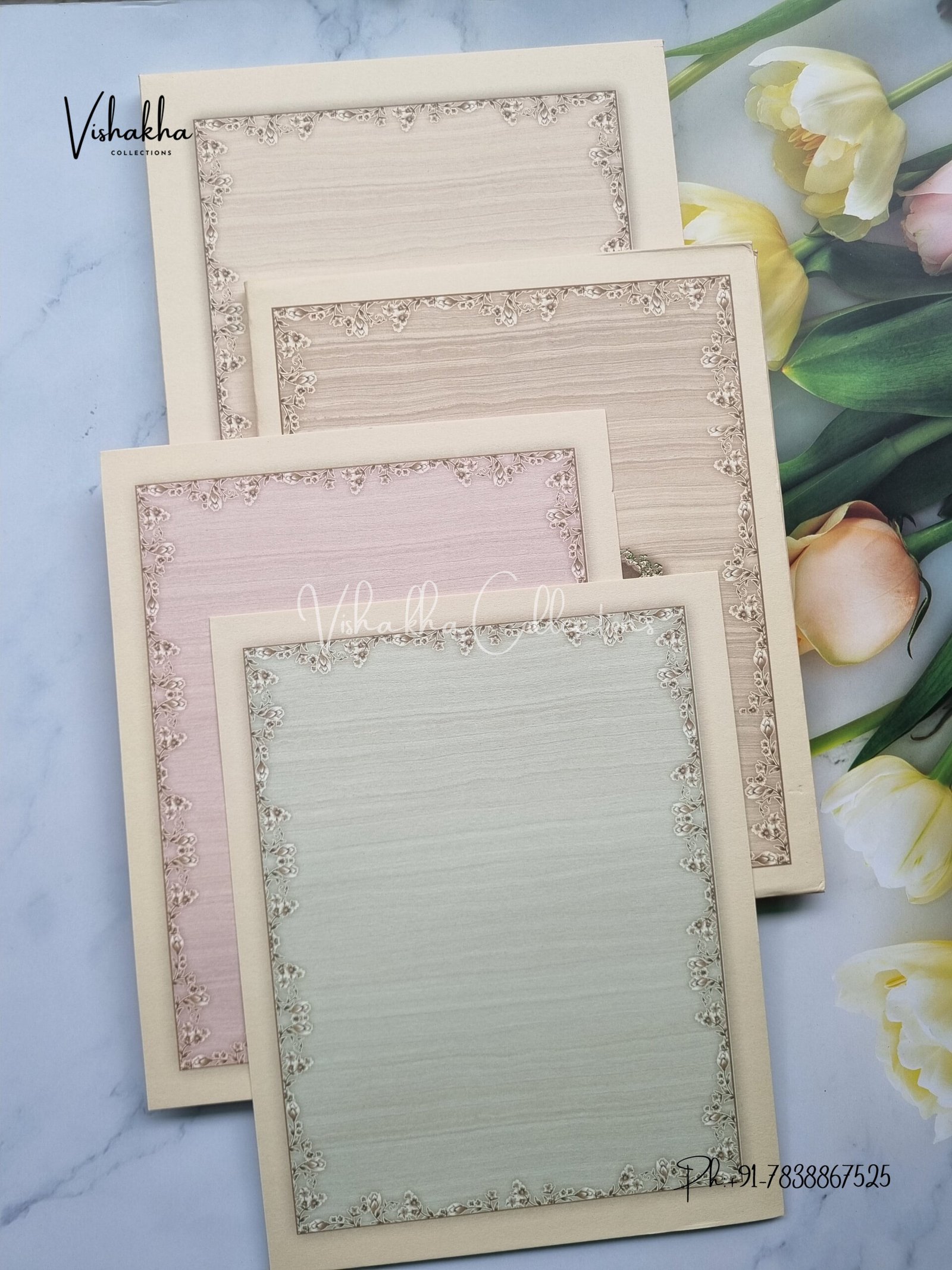 Vishakha Collections presents you beautiful luxury wedding invitation cards with all latest designs and the latest variety. Its just not a wedding invitation card but a beautiful feeling of love and relationship it carries for you. Beautifully printed and packed with a bundle of love. if you like it, dont think again, just go for it.If you are worrying about the quality of the product, send your doubts to us. We are here to help you. If you want in wholesale or bulk, dont forget to contact us.
