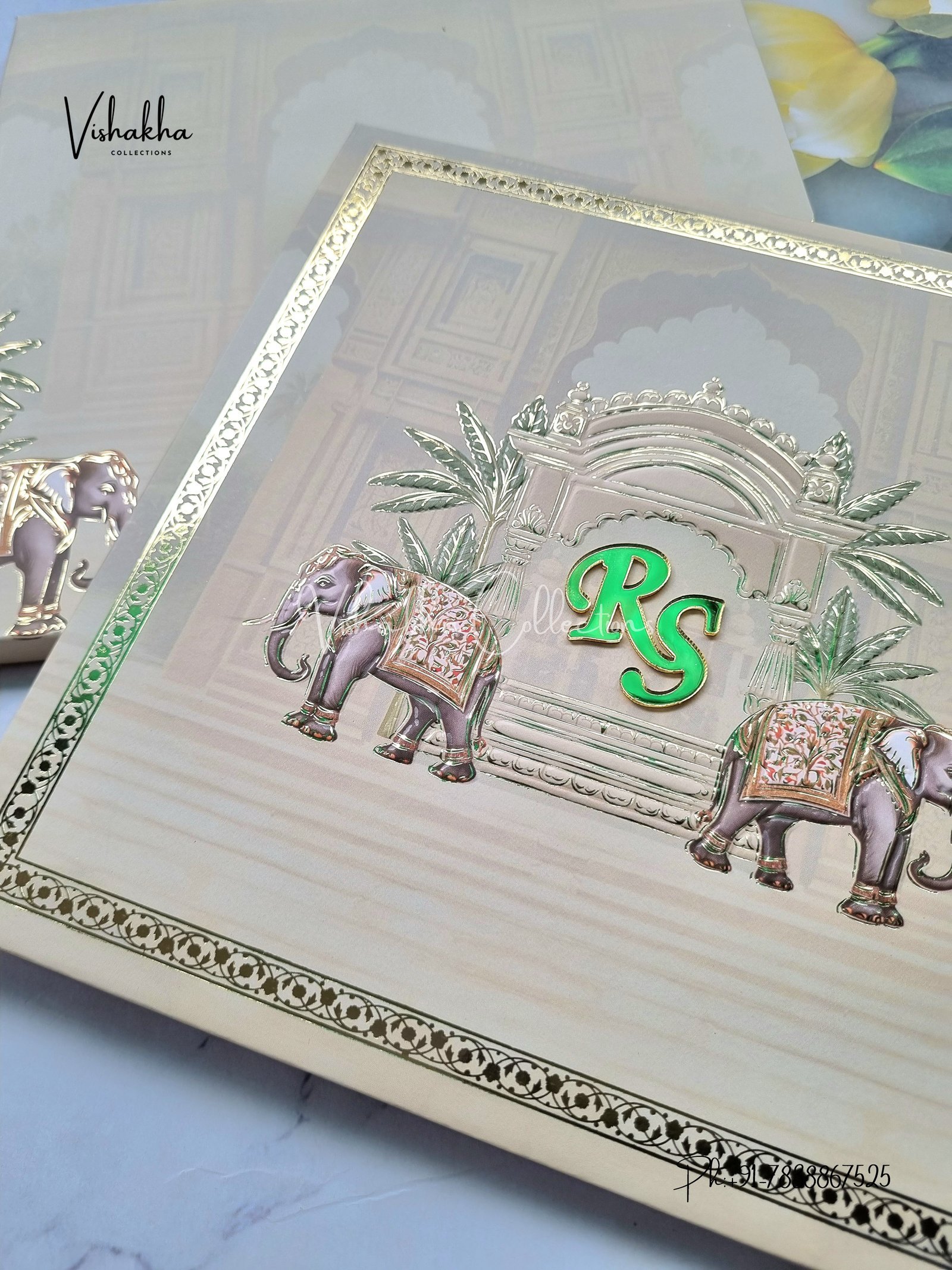 Hathi Hindu Muslim Christian Sikh Padded beige Colored invitation Cards SK-3395