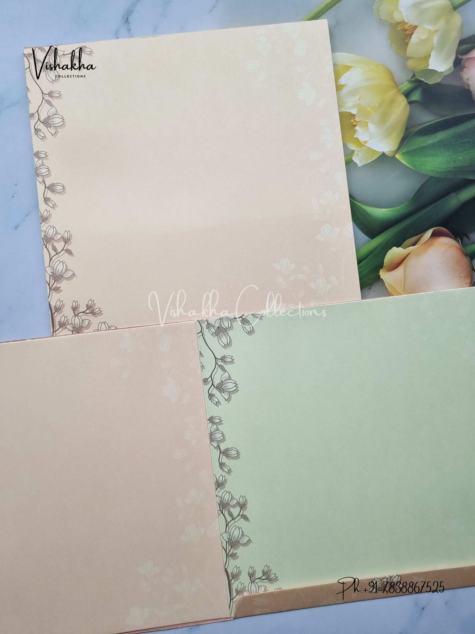 Vishakha Collections presents you beautiful luxury wedding invitation cards with all latest designs and the latest variety. Its just not a wedding invitation card but a beautiful feeling of love and relationship it carries for you. Beautifully printed and packed with a bundle of love. if you like it, dont think again, just go for it.If you are worrying about the quality of the product, send your doubts to us. We are here to help you. If you want in wholesale or bulk, dont forget to contact us.