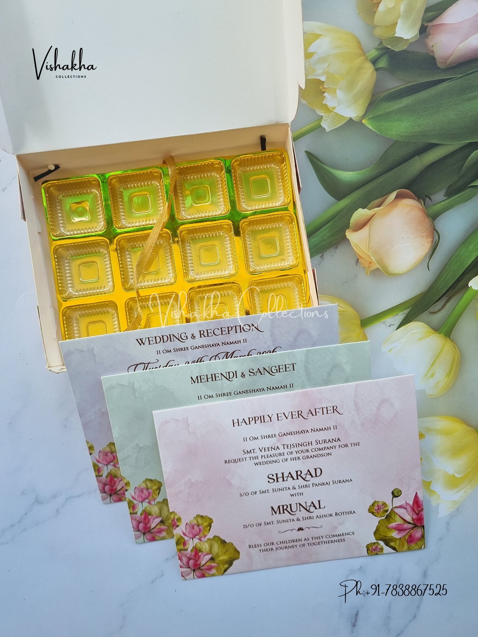 Vishakha Collections presents you beautiful luxury wedding invitation cards with all latest designs and the latest variety. Its just not a wedding invitation card but a beautiful feeling of love and relationship it carries for you. Beautifully printed and packed with a bundle of love. if you like it, dont think again, just go for it.If you are worrying about the quality of the product, send your doubts to us. We are here to help you. If you want in wholesale or bulk, dont forget to contact us.