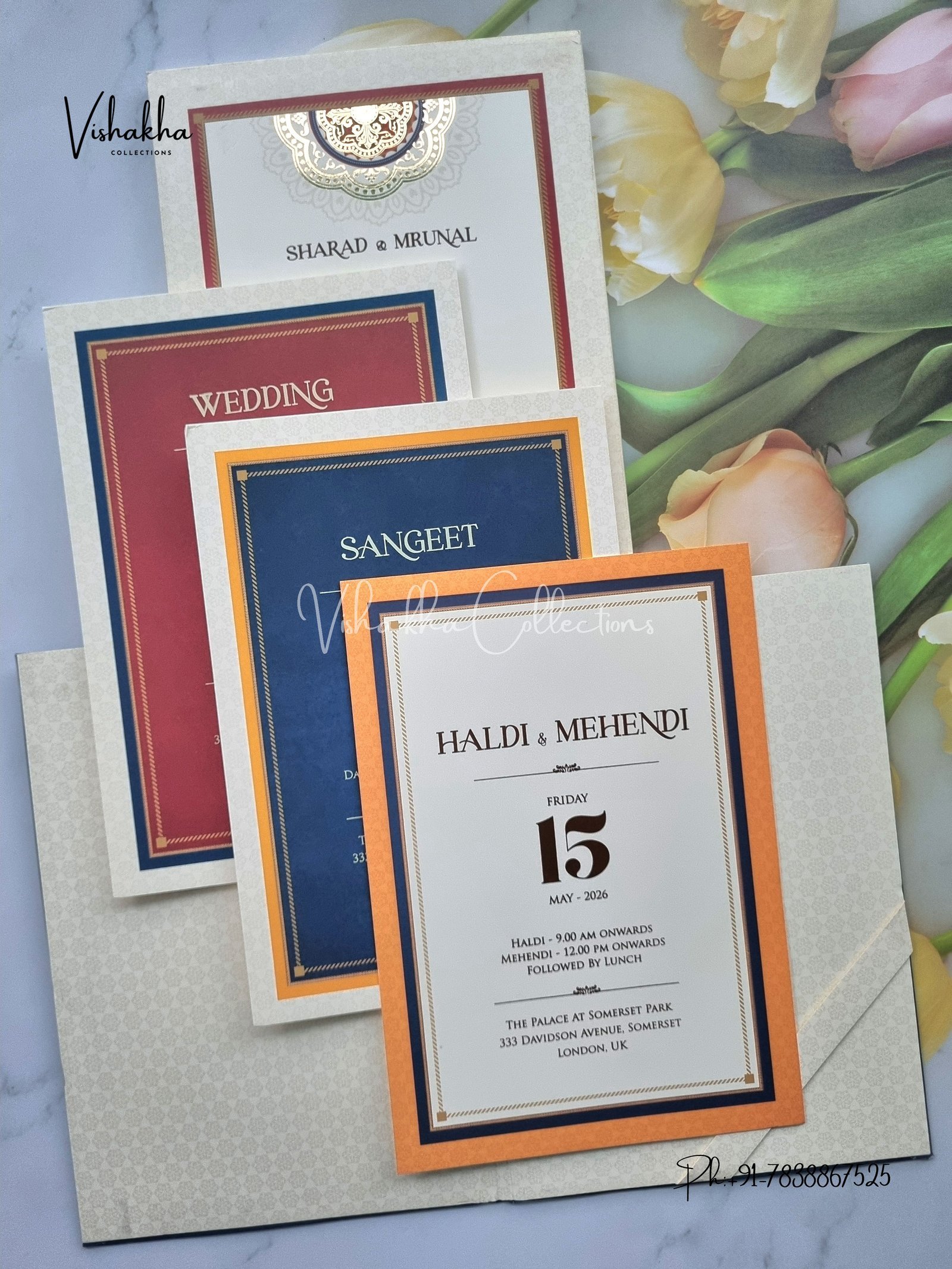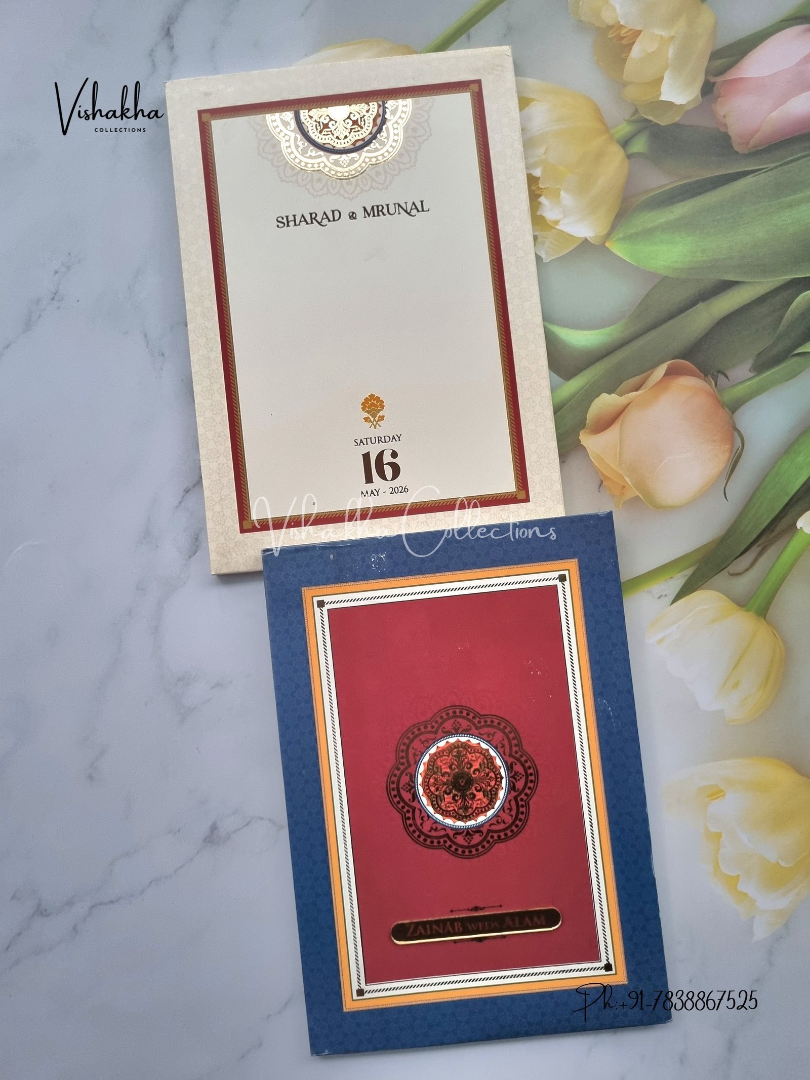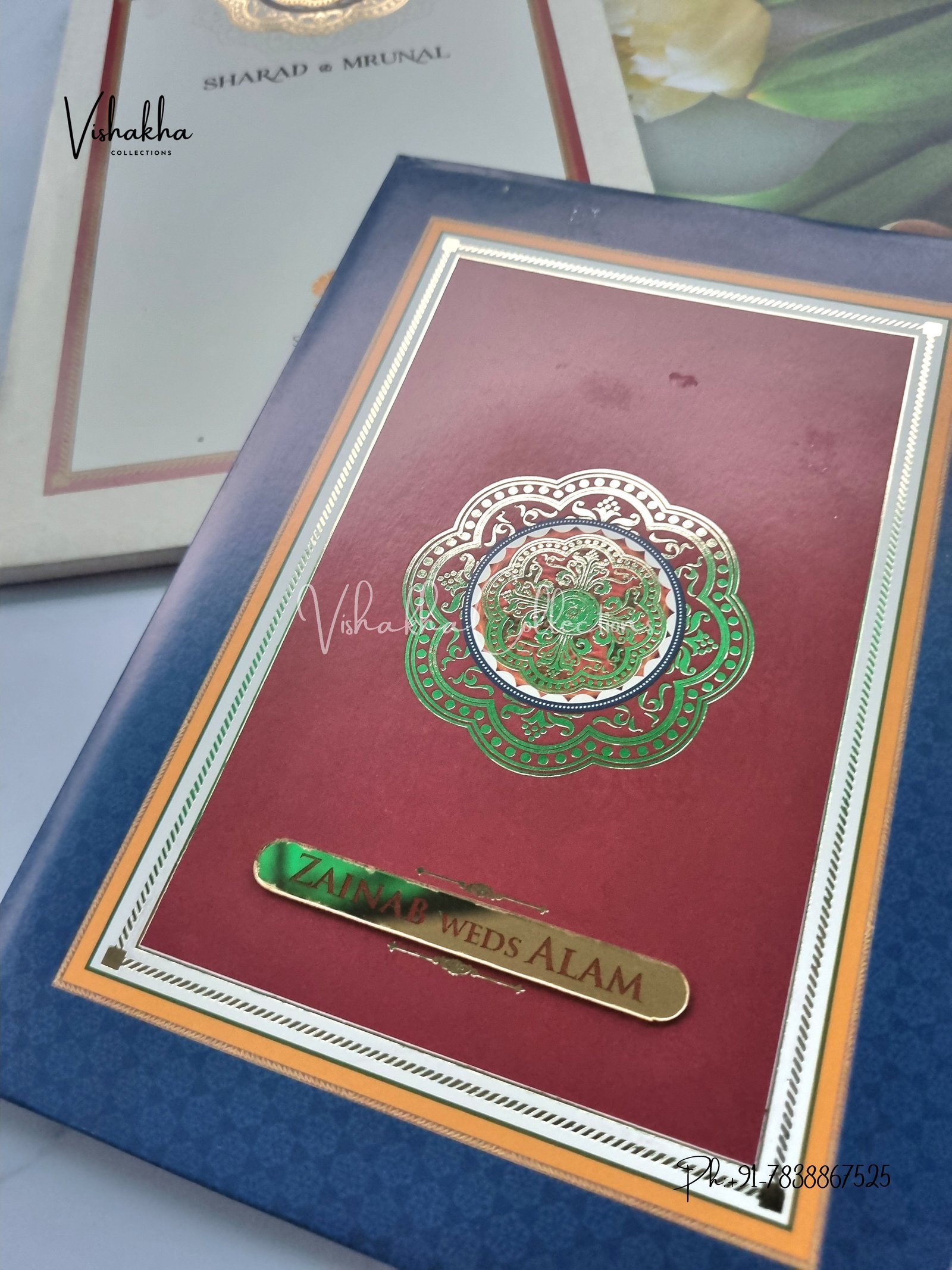 Vishakha Collections presents you beautiful luxury wedding invitation cards with all latest designs and the latest variety. Its just not a wedding invitation card but a beautiful feeling of love and relationship it carries for you. Beautifully printed and packed with a bundle of love. if you like it, dont think again, just go for it.If you are worrying about the quality of the product, send your doubts to us. We are here to help you. If you want in wholesale or bulk, dont forget to contact us.