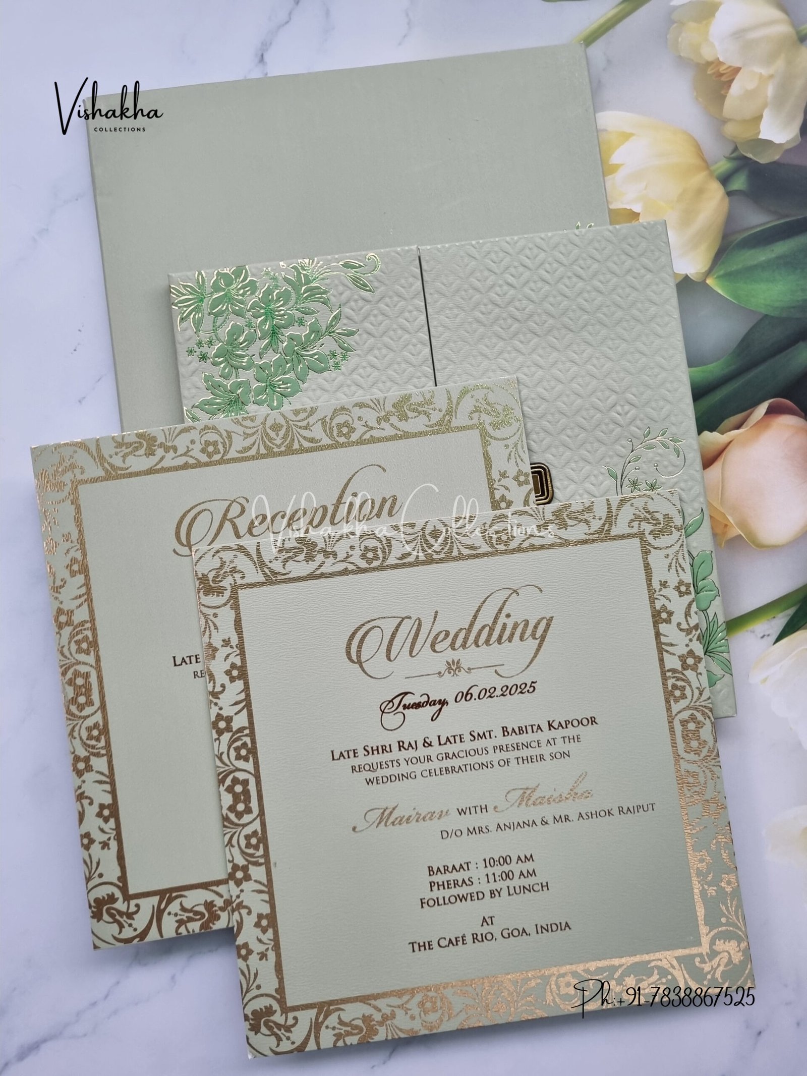 Vishakha Collections presents you beautiful luxury wedding invitation cards with all latest designs and the latest variety. Its just not a wedding invitation card but a beautiful feeling of love and relationship it carries for you. Beautifully printed and packed with a bundle of love. if you like it, dont think again, just go for it.If you are worrying about the quality of the product, send your doubts to us. We are here to help you. If you want in wholesale or bulk, dont forget to contact us.