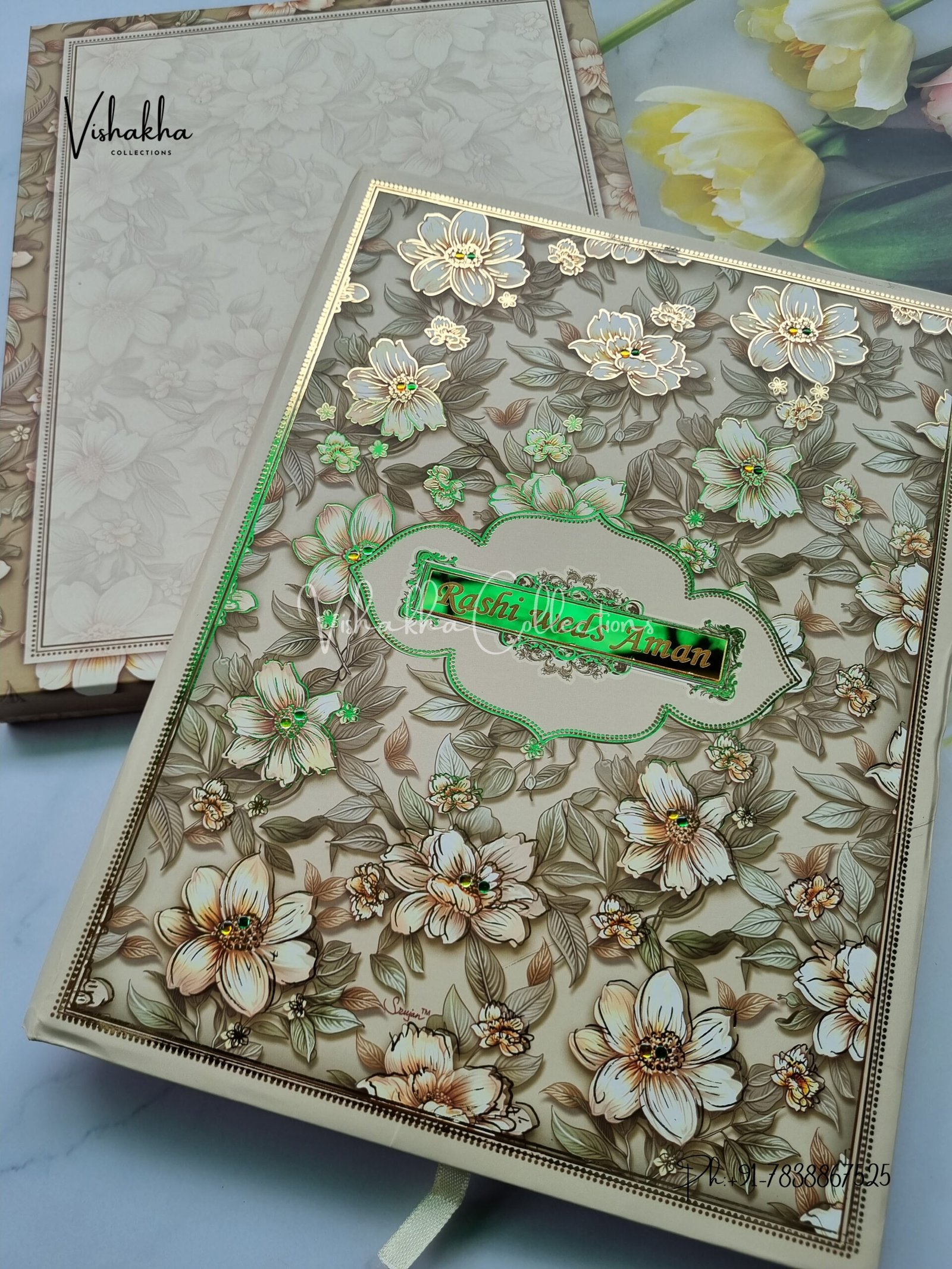 Vishakha Collections presents you beautiful luxury wedding invitation cards with all latest designs and the latest variety. Its just not a wedding invitation card but a beautiful feeling of love and relationship it carries for you. Beautifully printed and packed with a bundle of love. if you like it, dont think again, just go for it.If you are worrying about the quality of the product, send your doubts to us. We are here to help you. If you want in wholesale or bulk, dont forget to contact us.