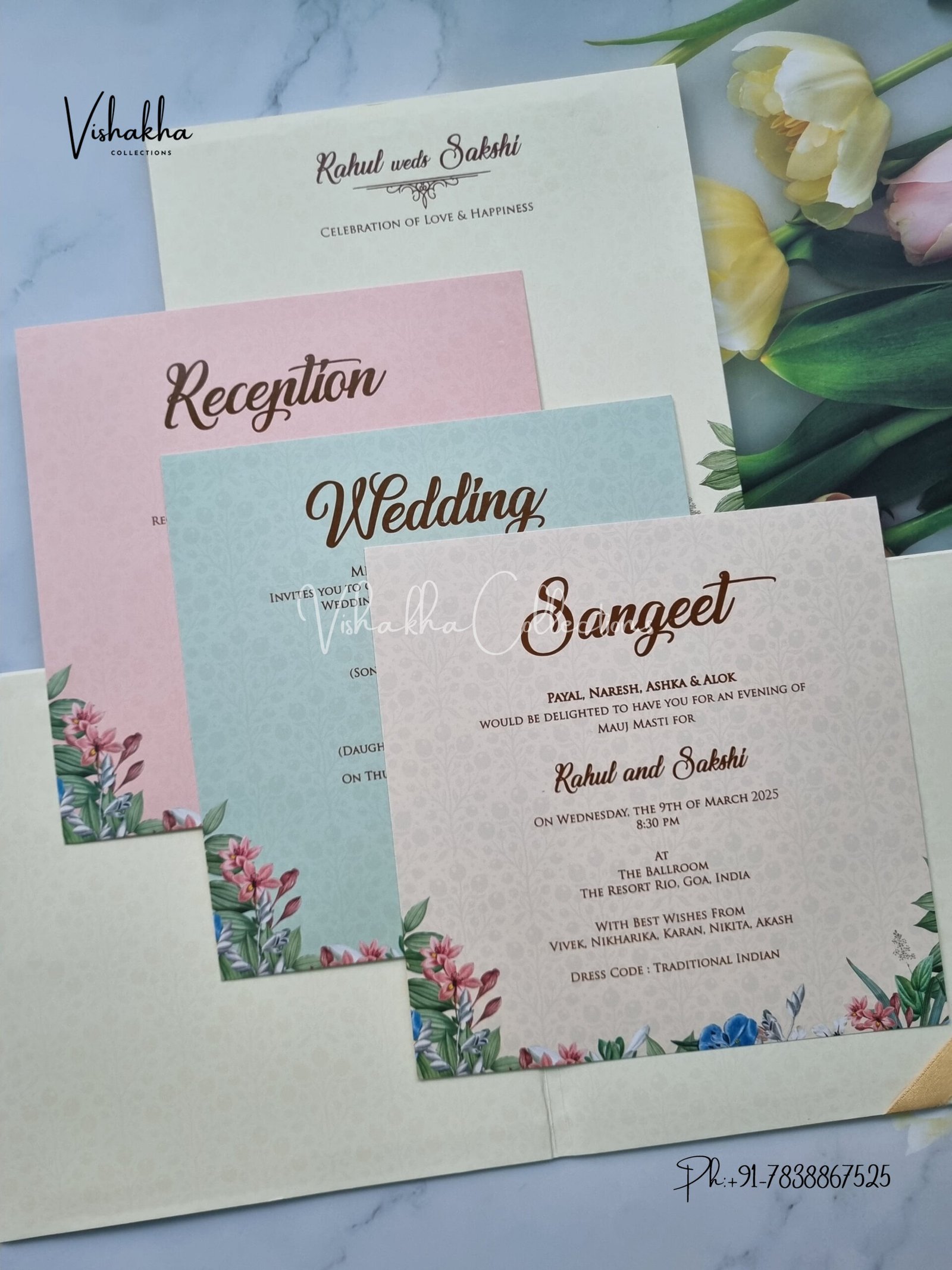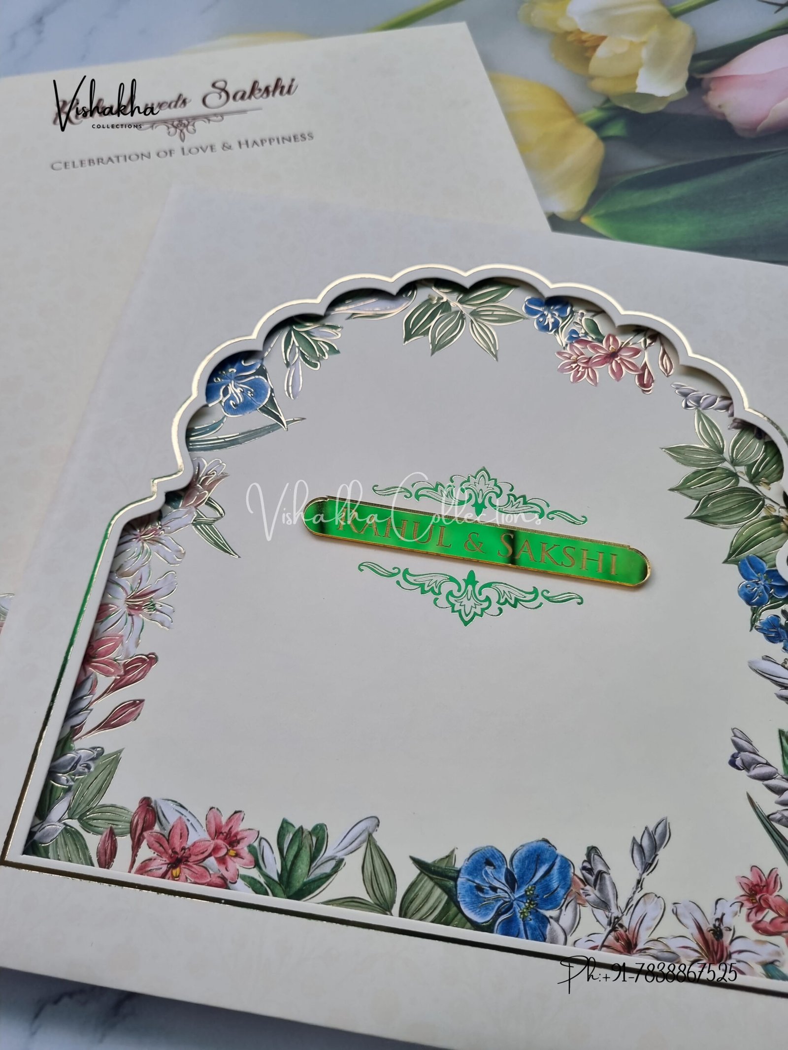 Vishakha Collections presents you beautiful luxury wedding invitation cards with all latest designs and the latest variety. Its just not a wedding invitation card but a beautiful feeling of love and relationship it carries for you. Beautifully printed and packed with a bundle of love. if you like it, dont think again, just go for it.If you are worrying about the quality of the product, send your doubts to us. We are here to help you. If you want in wholesale or bulk, dont forget to contact us.