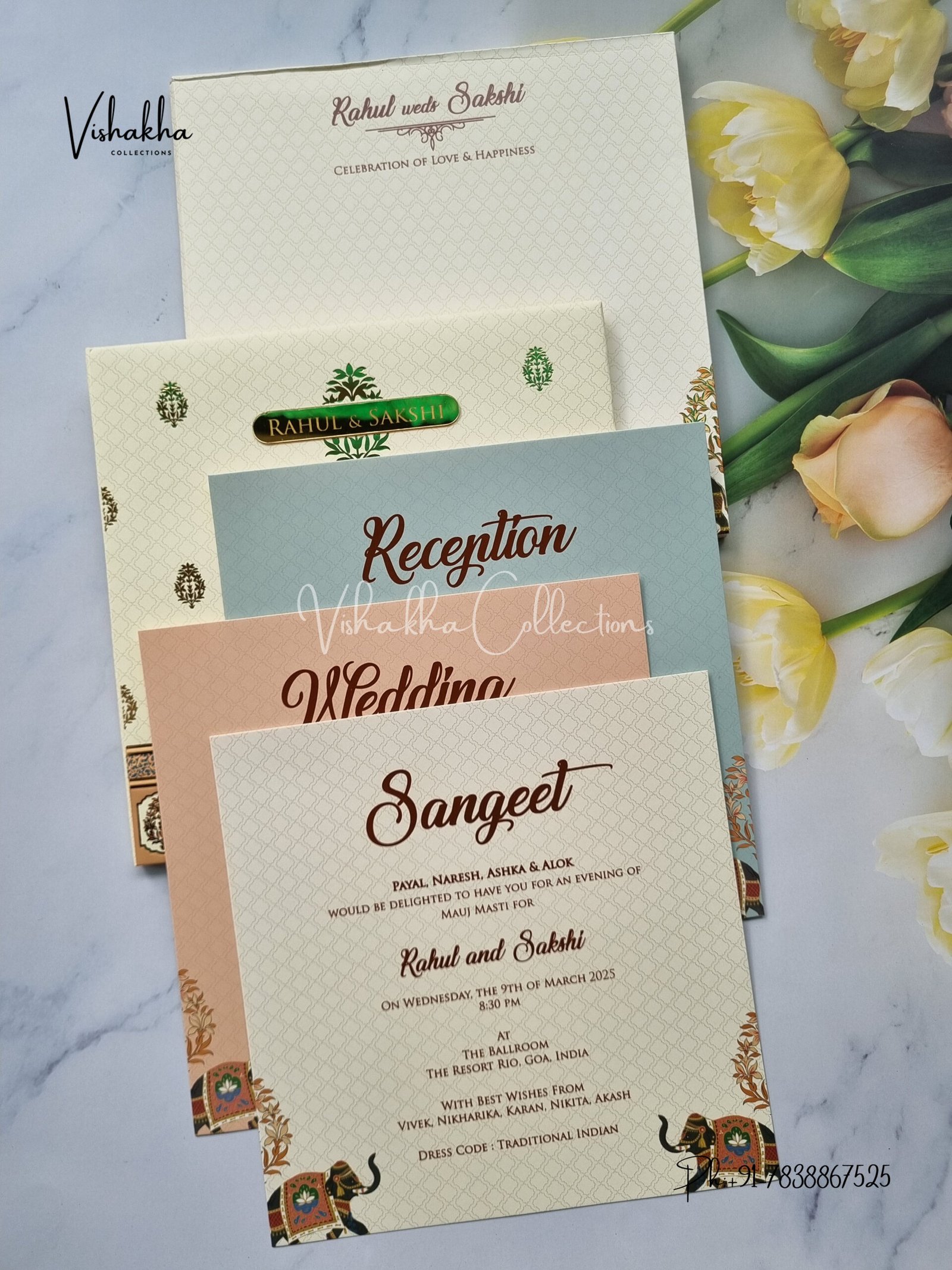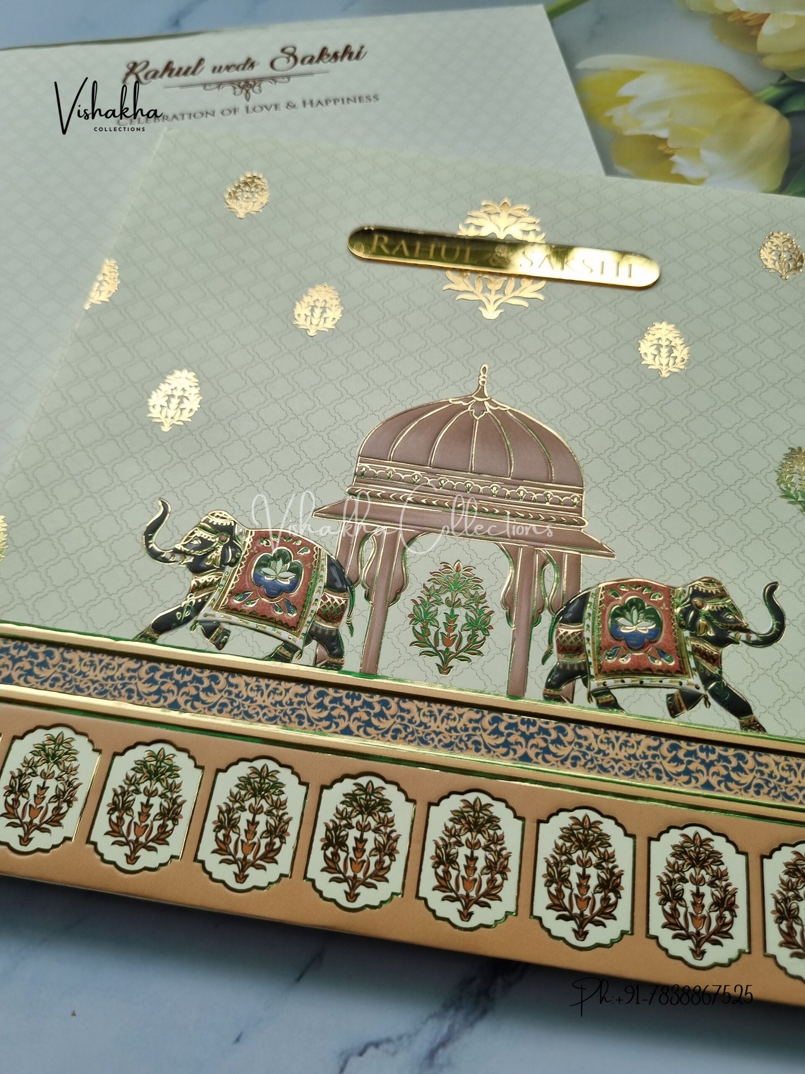 ₹126.00Pale yellow traditional elephant padded with name plate Wedding Invitation Card SK-3304