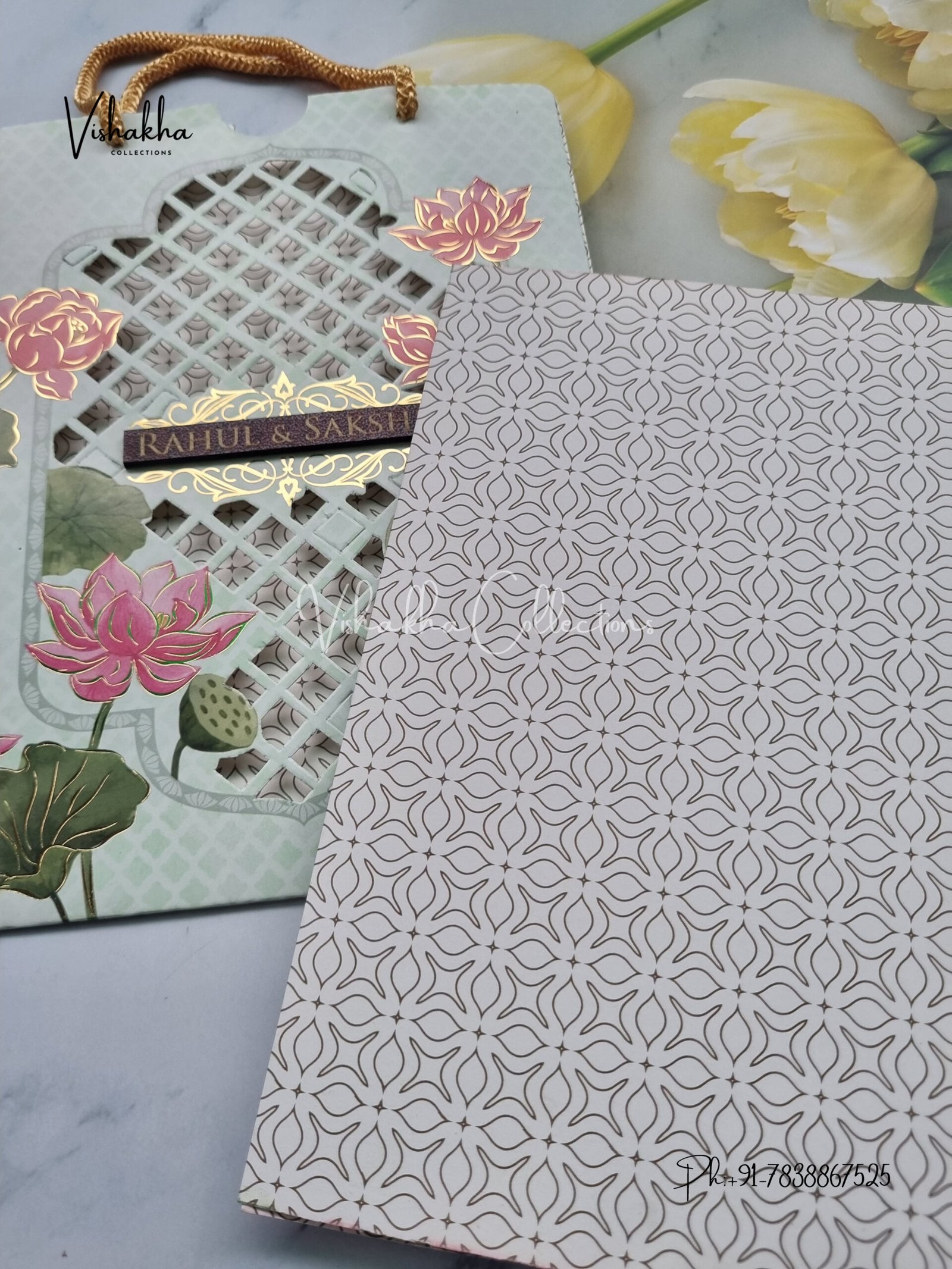 Vishakha Collections presents you beautiful luxury wedding invitation cards with all latest designs and the latest variety. Its just not a wedding invitation card but a beautiful feeling of love and relationship it carries for you. Beautifully printed and packed with a bundle of love. if you like it, dont think again, just go for it.If you are worrying about the quality of the product, send your doubts to us. We are here to help you. If you want in wholesale or bulk, dont forget to contact us.