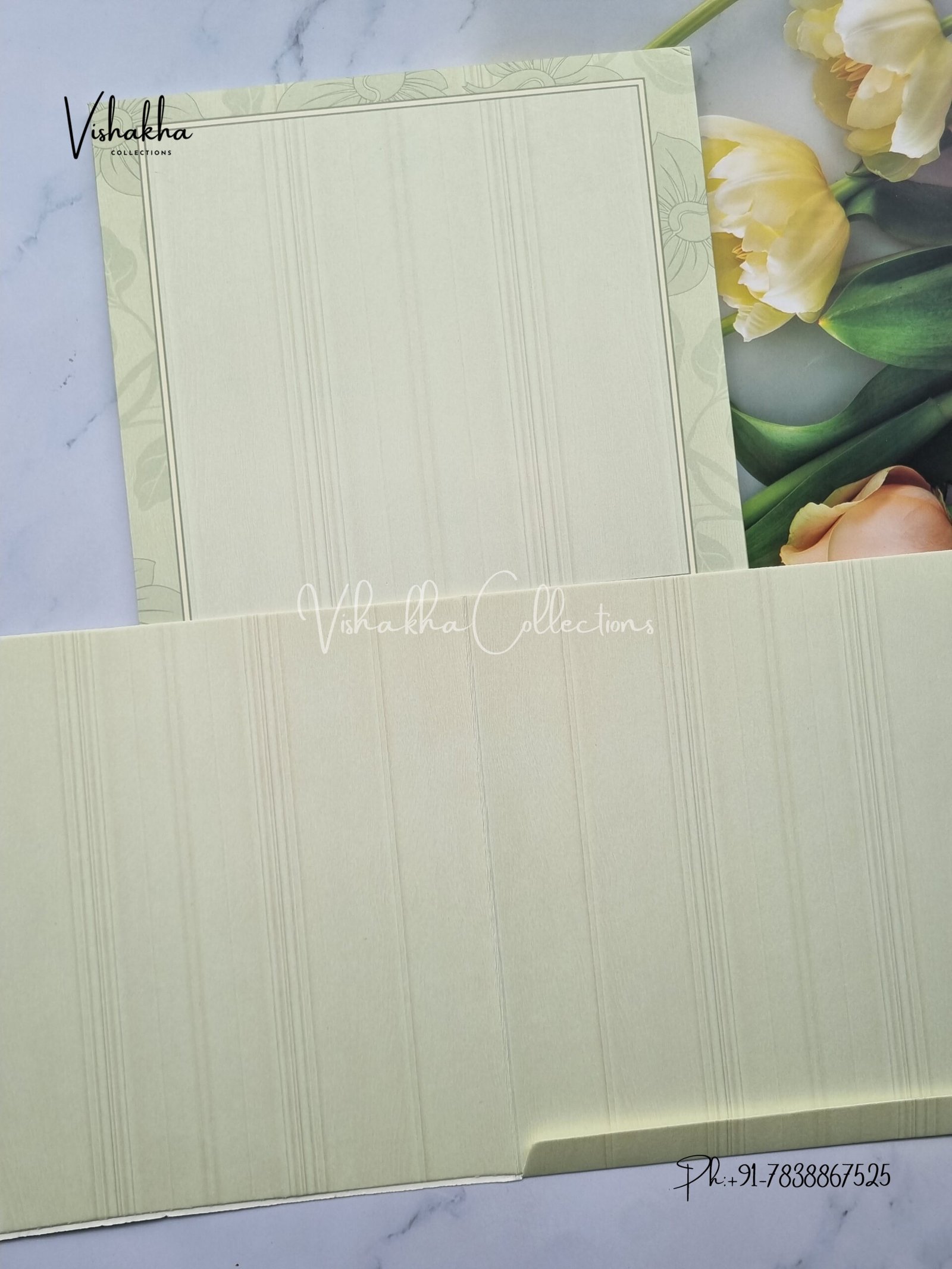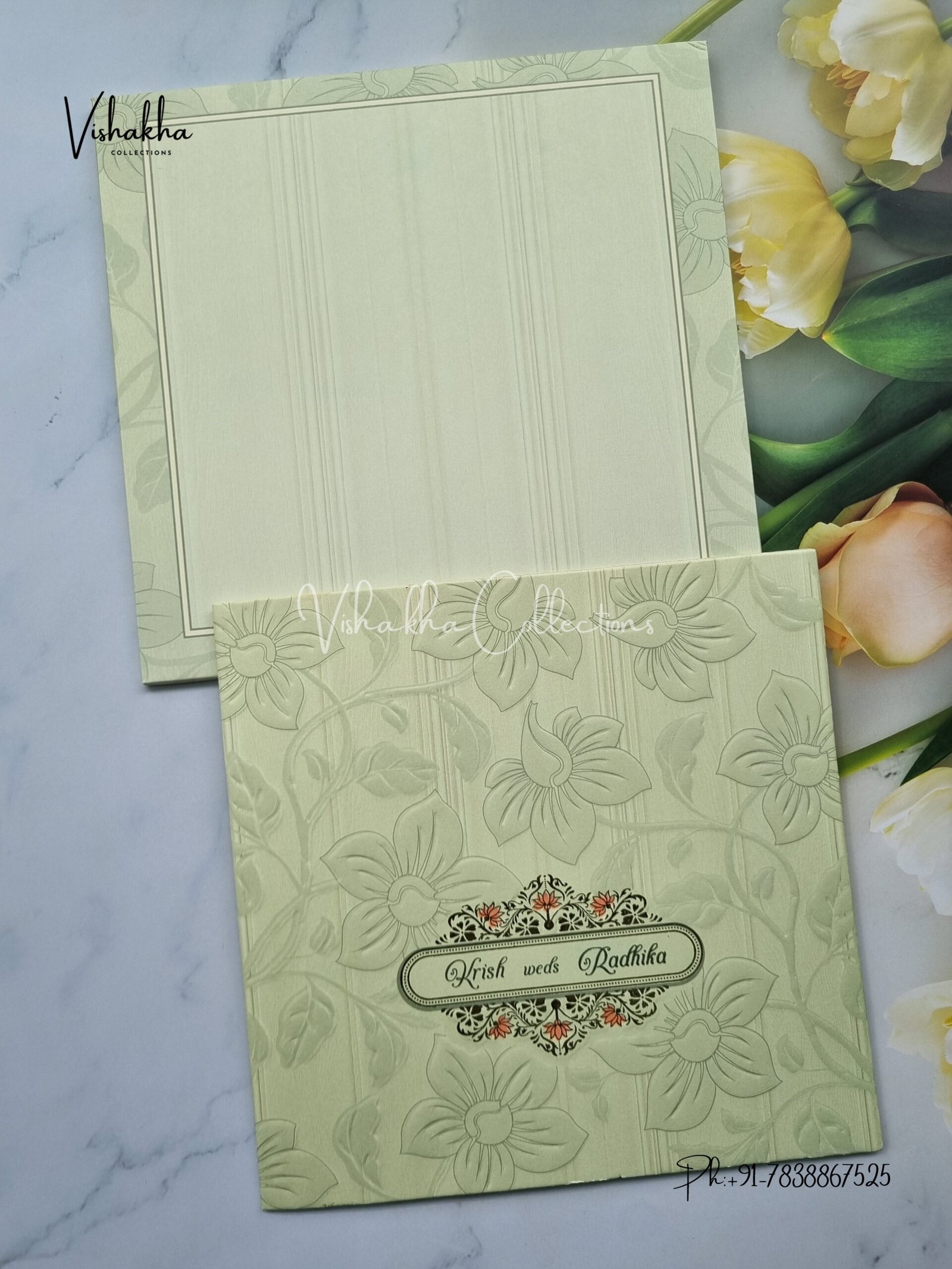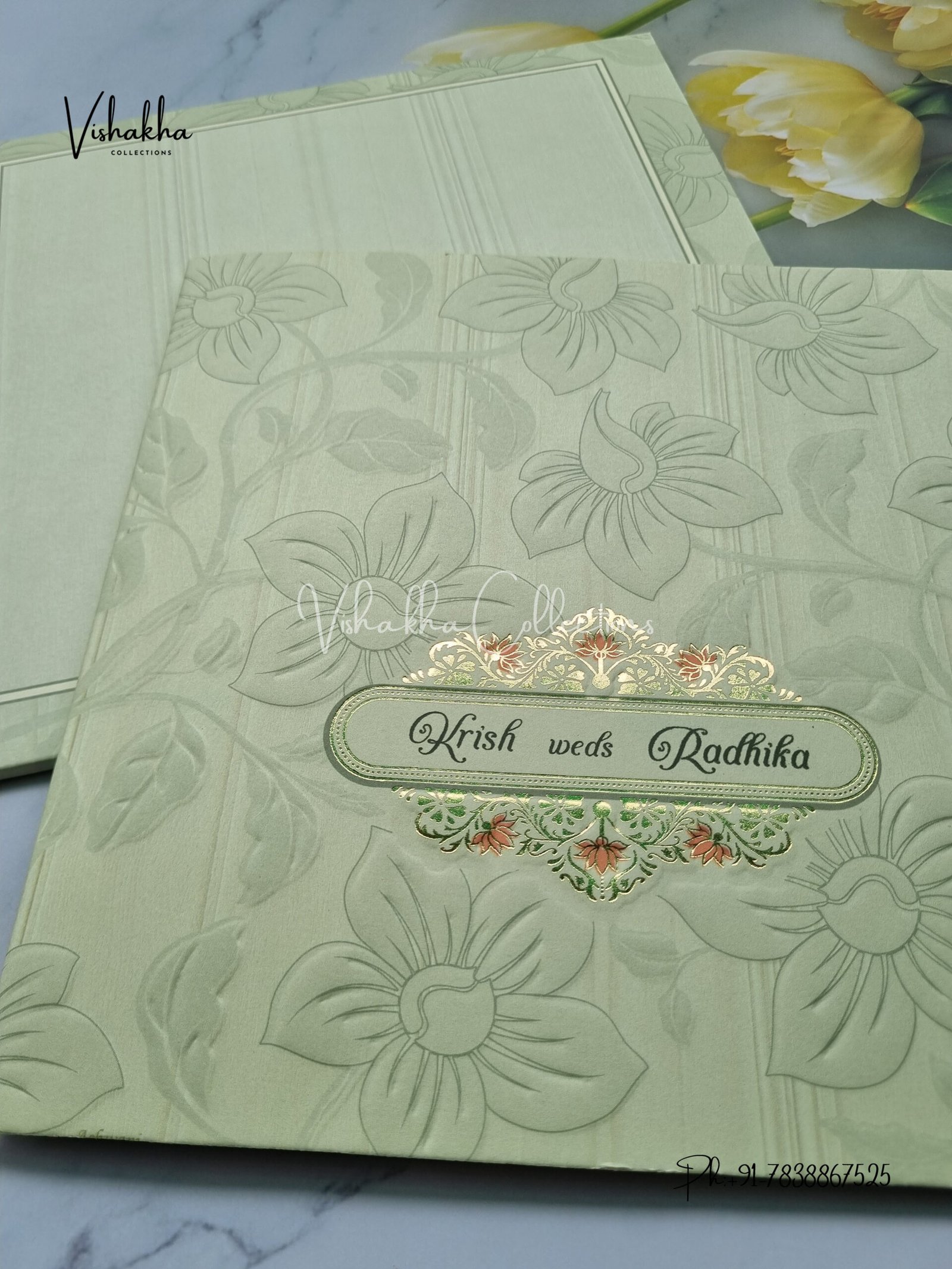Vishakha Collections presents you beautiful luxury wedding invitation cards with all latest designs and the latest variety. Its just not a wedding invitation card but a beautiful feeling of love and relationship it carries for you. Beautifully printed and packed with a bundle of love. if you like it, dont think again, just go for it.If you are worrying about the quality of the product, send your doubts to us. We are here to help you. If you want in wholesale or bulk, dont forget to contact us.