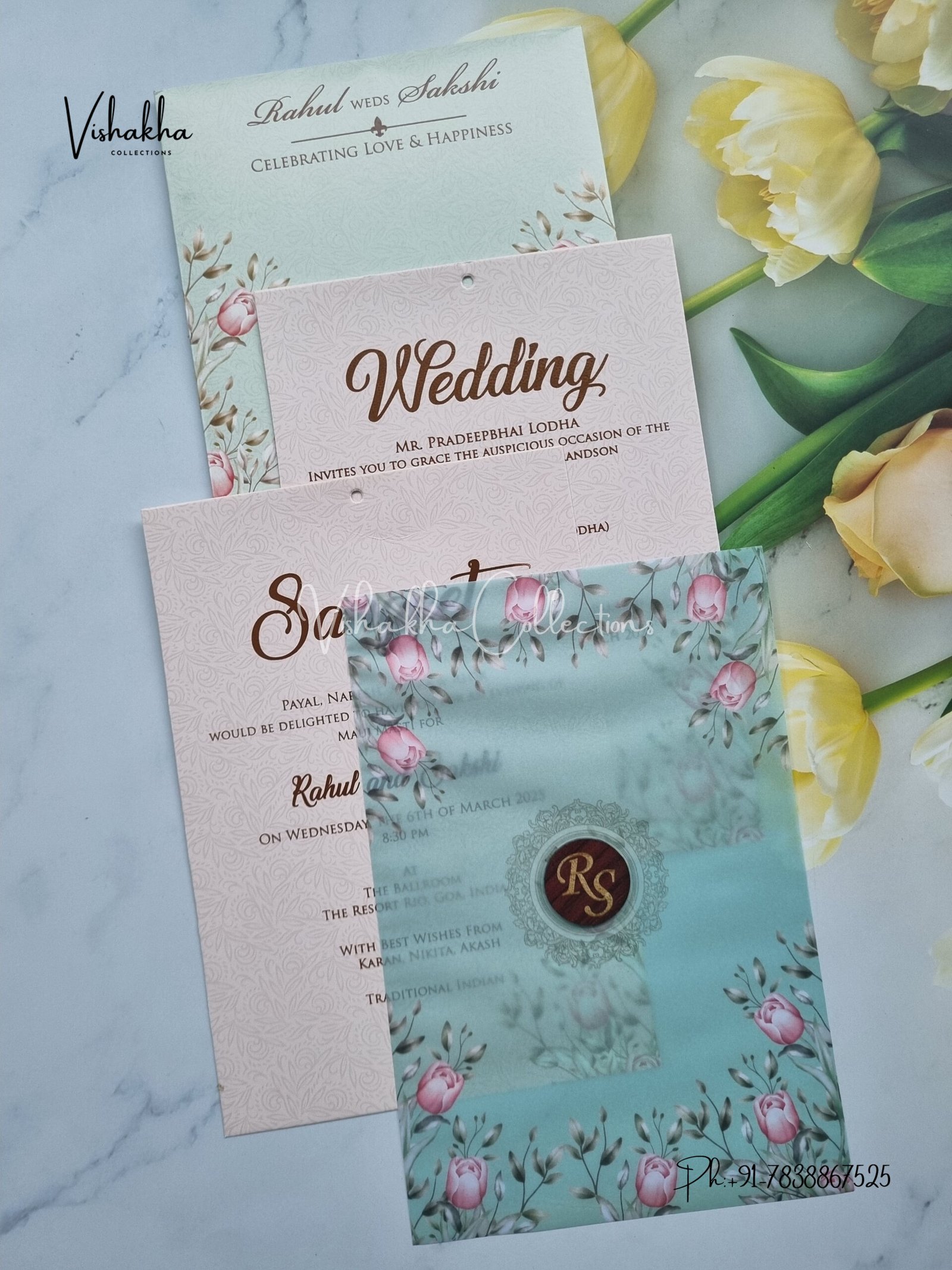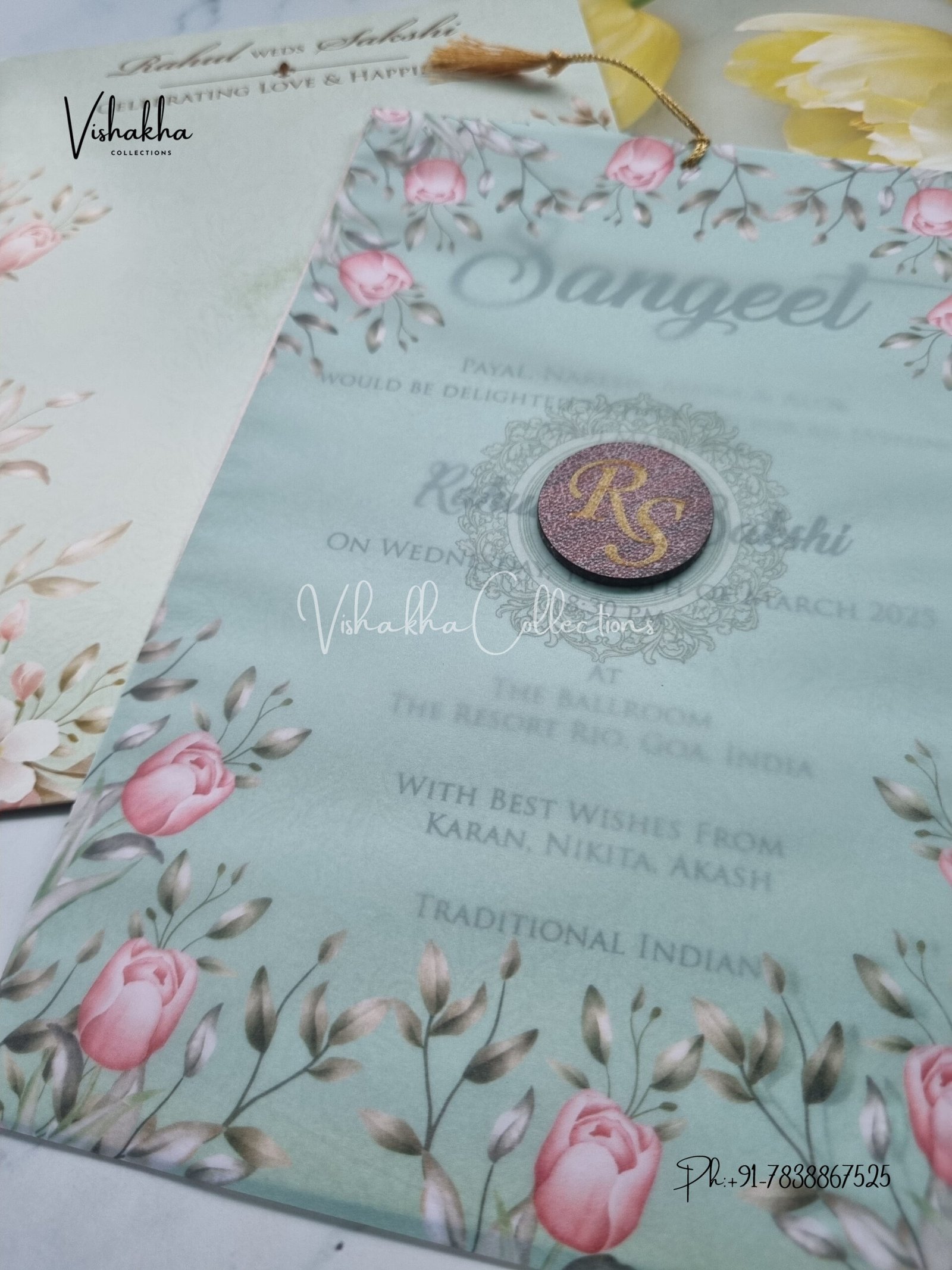 ₹40.00Pastel green floral with butter paper and wooden name plate Wedding Invitation Card SK-3336