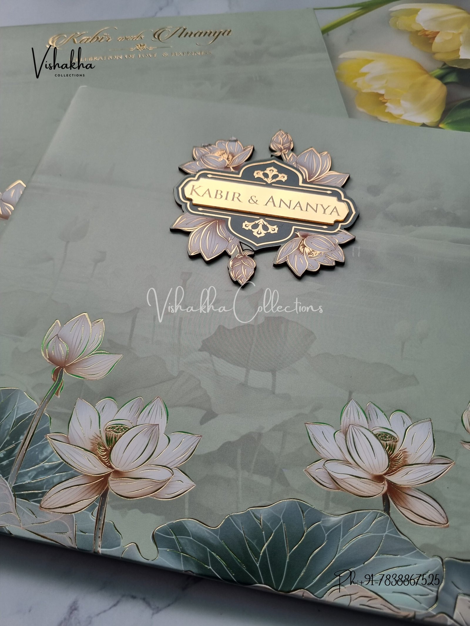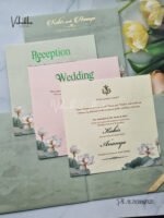 ₹118.00Pastel green White lotus MDF cut out with name plate Wedding Invitation Card SK-3403