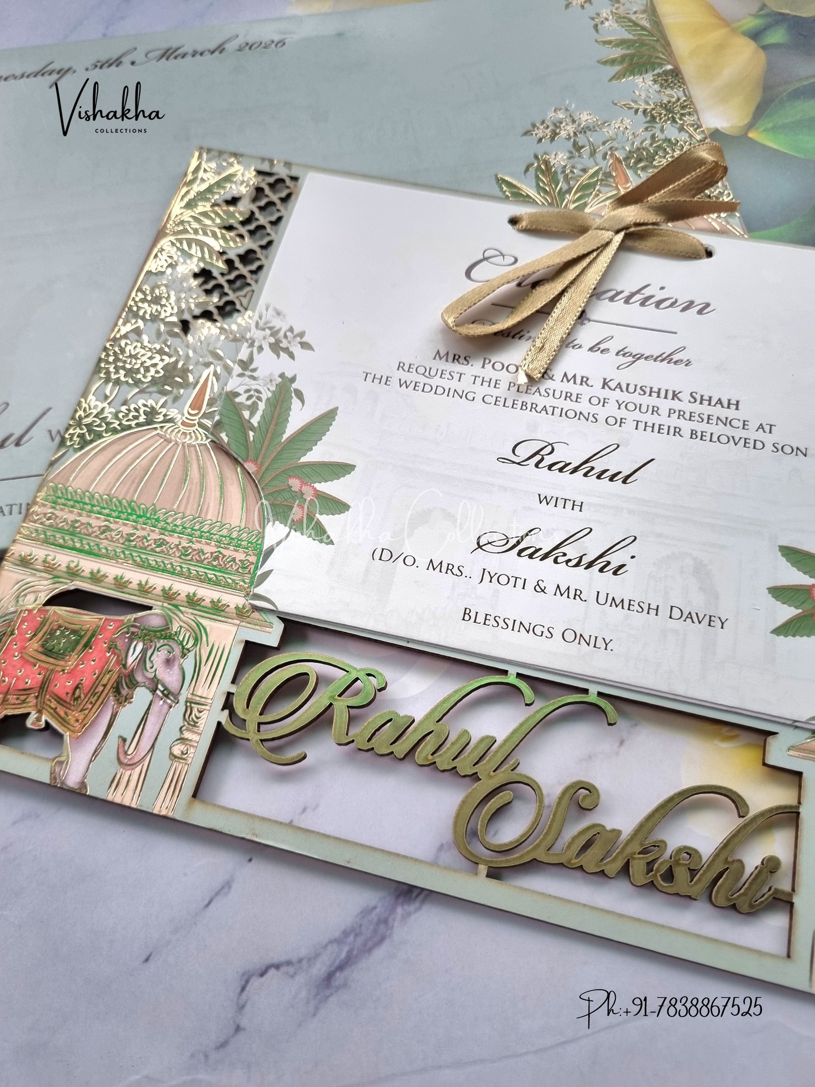 ₹80.00Semi Box Hathi Hindu Muslim Christian Sikh Named MDF Laser Cut light green Colored invitation Cards SK-3357