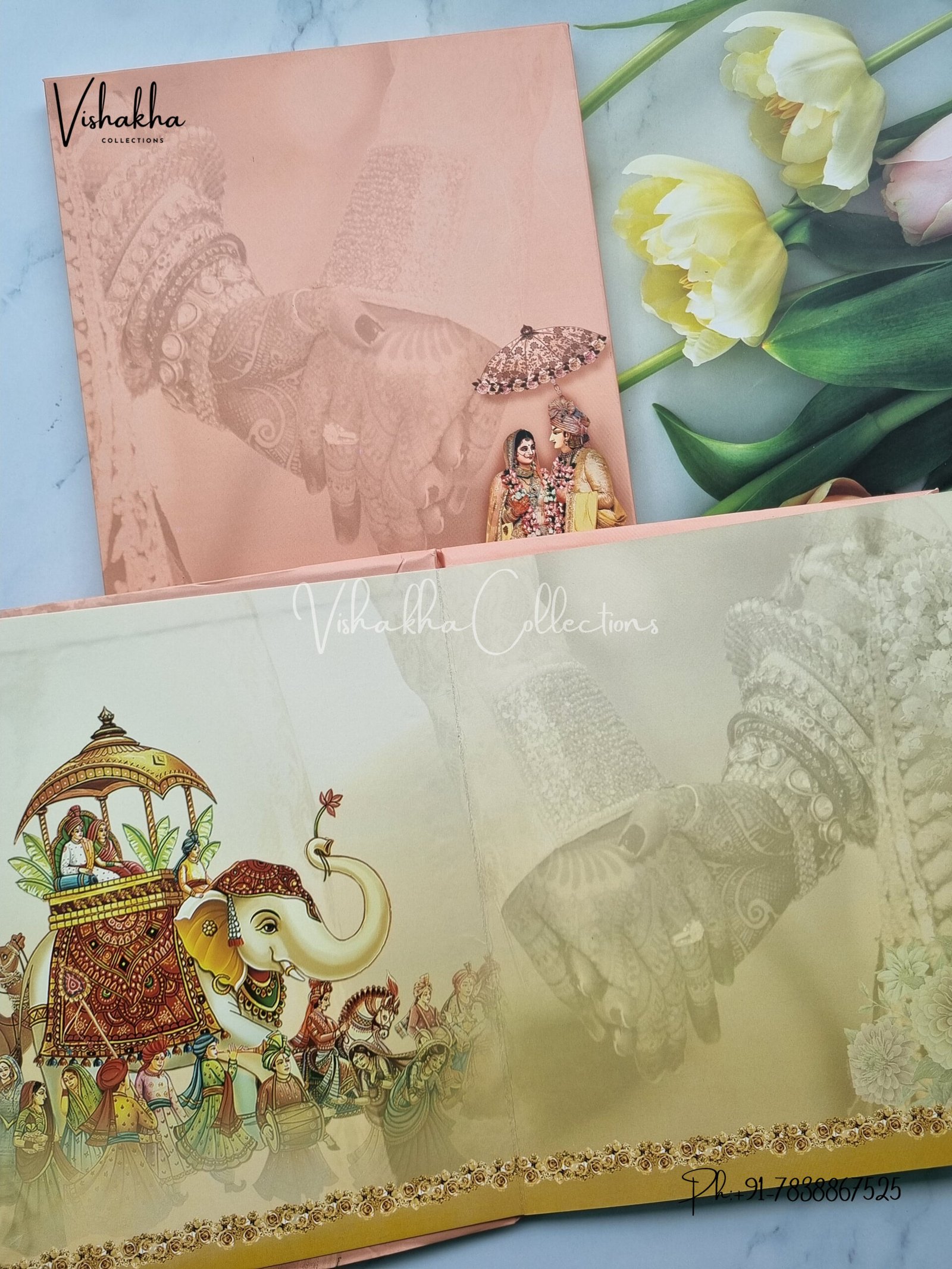 Vishakha Collections presents you beautiful luxury wedding invitation cards with all latest designs and the latest variety. Its just not a wedding invitation card but a beautiful feeling of love and relationship it carries for you. Beautifully printed and packed with a bundle of love. if you like it, dont think again, just go for it.If you are worrying about the quality of the product, send your doubts to us. We are here to help you. If you want in wholesale or bulk, dont forget to contact us.