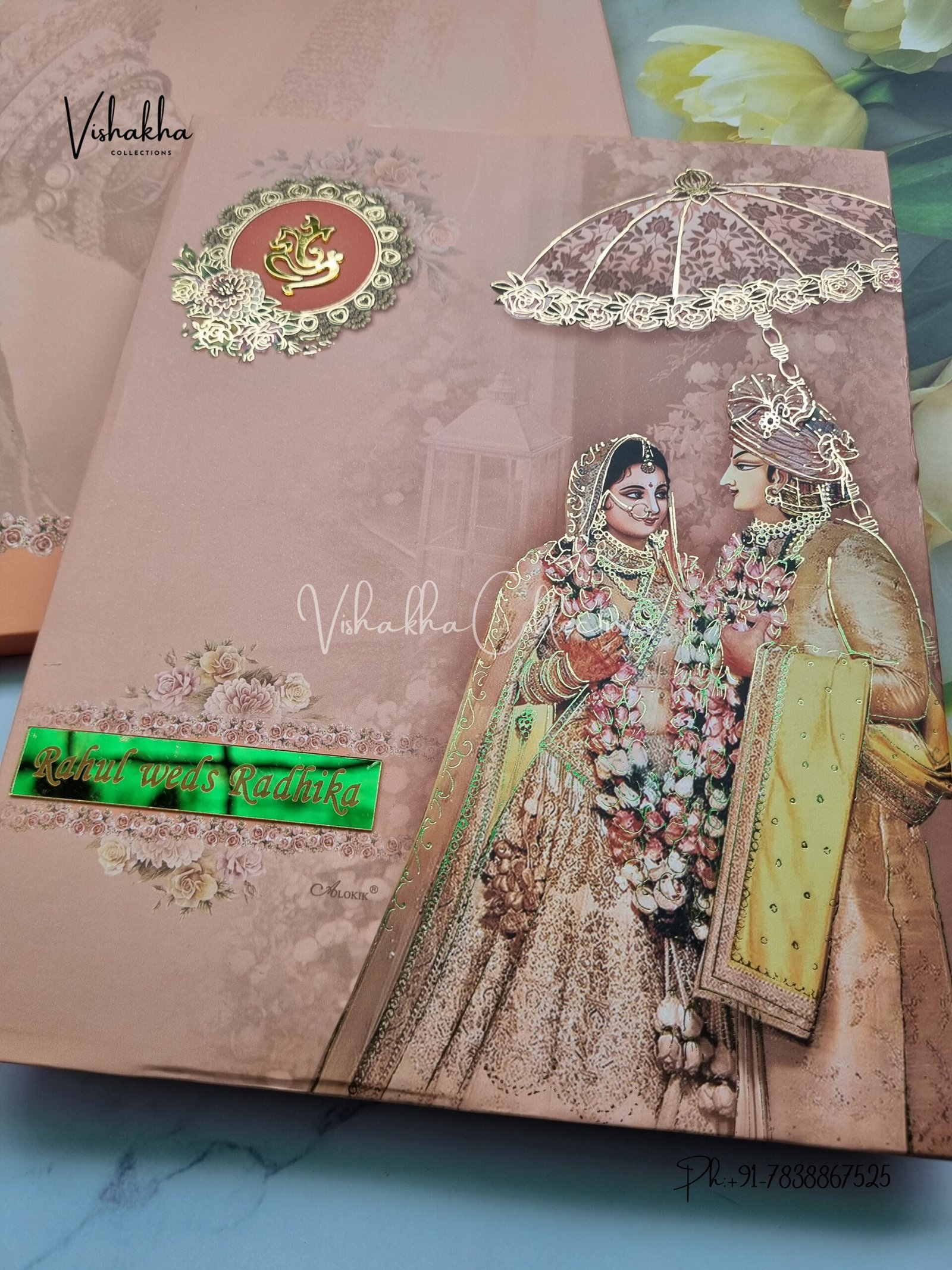 ₹80.00Peach colour floral pattern with Dulha dulhan and acrylic ganesha padded heavy marriage card