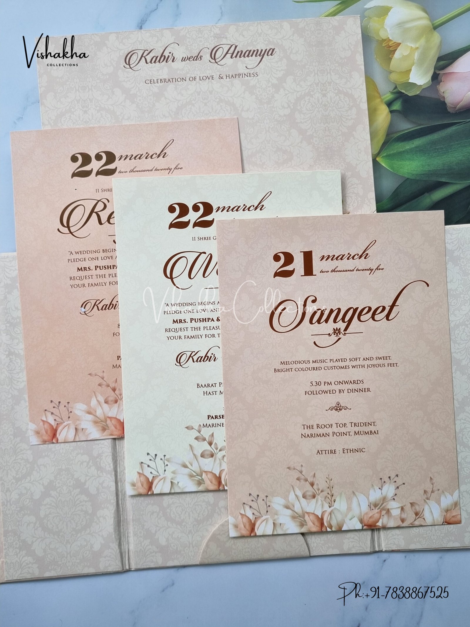Vishakha Collections presents you beautiful luxury wedding invitation cards with all latest designs and the latest variety. Its just not a wedding invitation card but a beautiful feeling of love and relationship it carries for you. Beautifully printed and packed with a bundle of love. if you like it, dont think again, just go for it.If you are worrying about the quality of the product, send your doubts to us. We are here to help you. If you want in wholesale or bulk, dont forget to contact us.