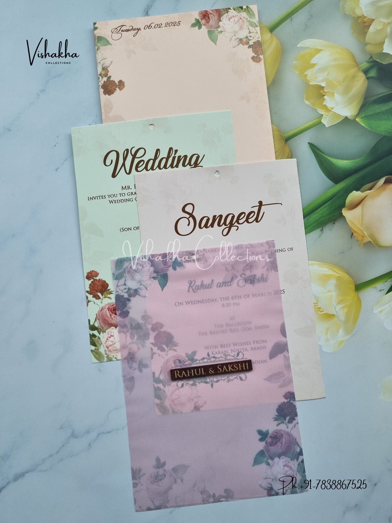 Vishakha Collections presents you beautiful luxury wedding invitation cards with all latest designs and the latest variety. Its just not a wedding invitation card but a beautiful feeling of love and relationship it carries for you. Beautifully printed and packed with a bundle of love. if you like it, dont think again, just go for it.If you are worrying about the quality of the product, send your doubts to us. We are here to help you. If you want in wholesale or bulk, dont forget to contact us.