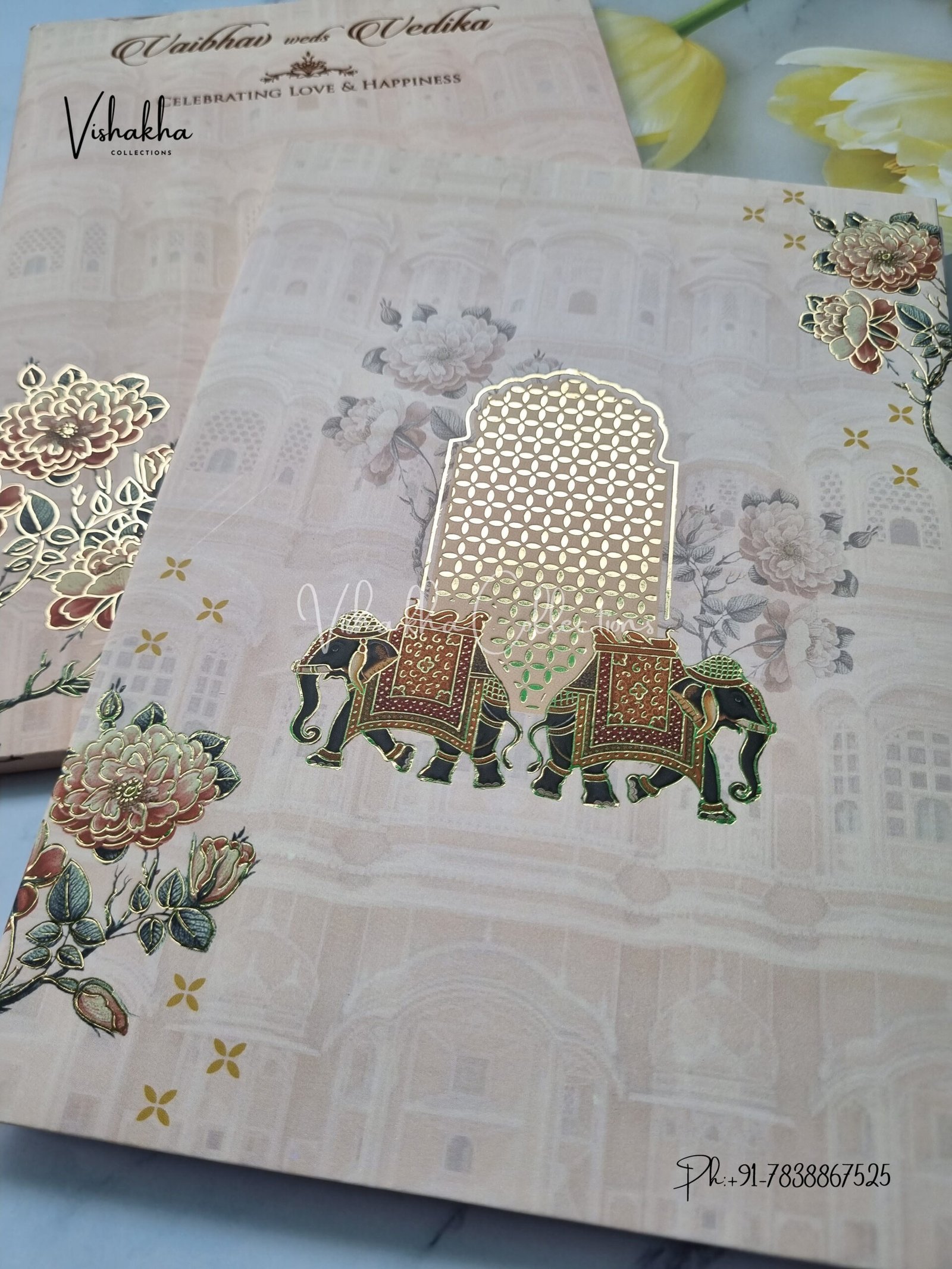₹80.00Peach Rajasthani Hawa mahal traditional padded Wedding Invitation Card SK-3144