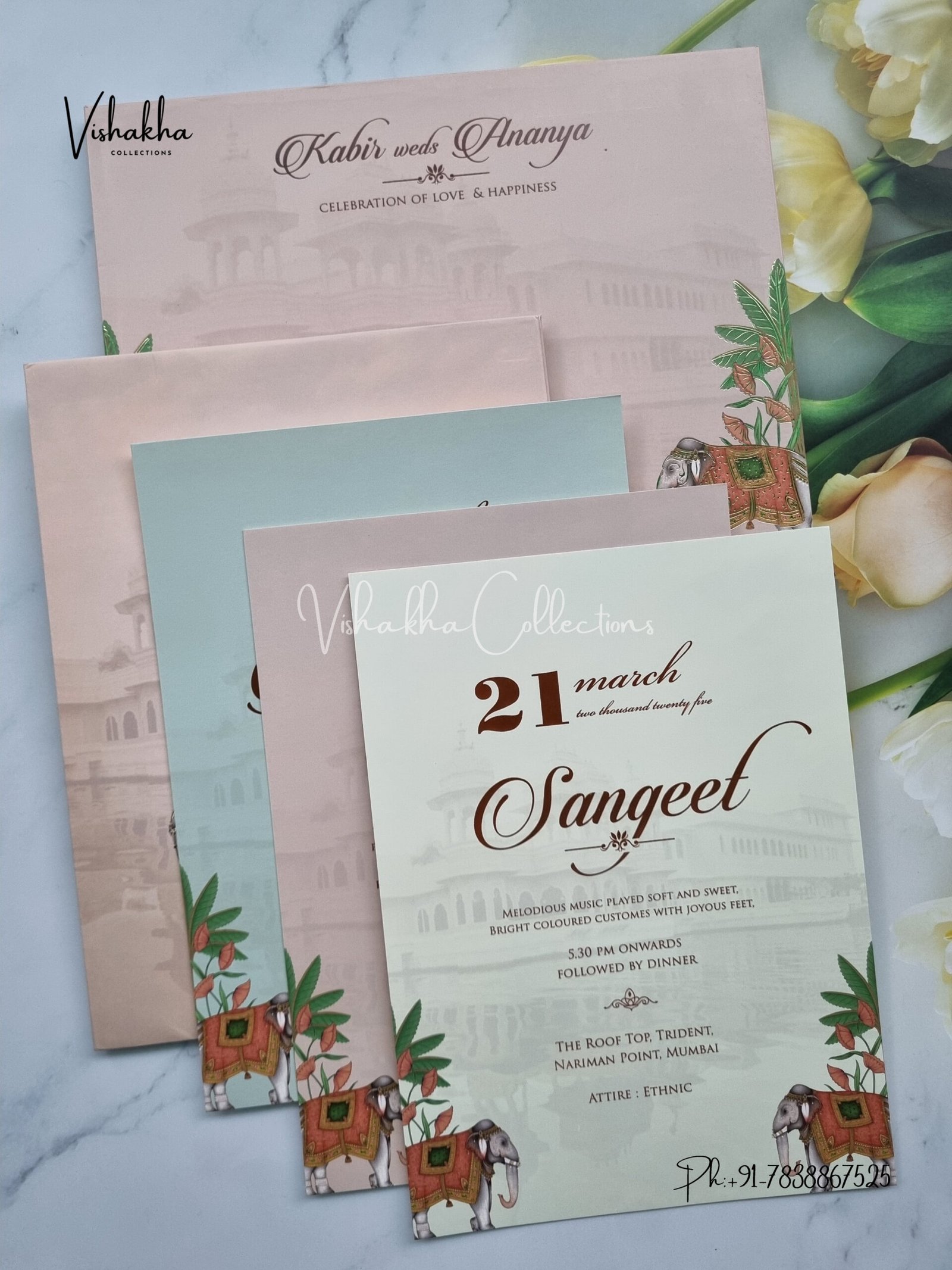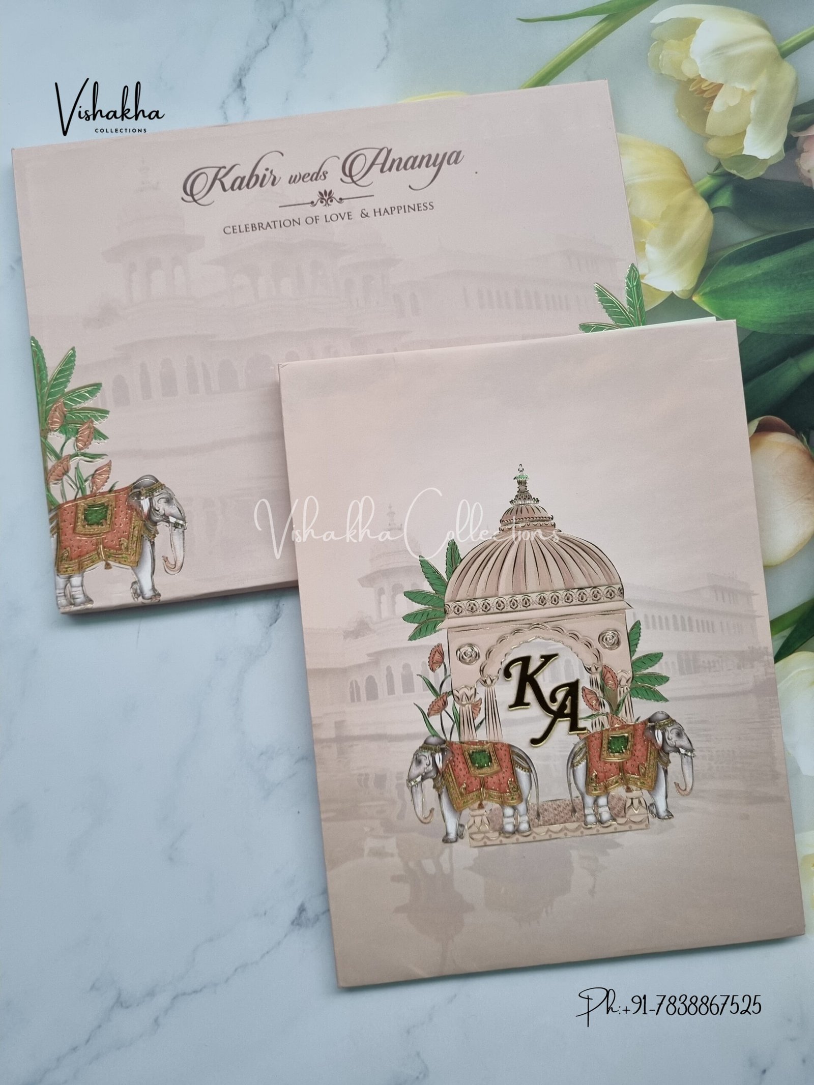 ₹156.00Peach Traditional elephant with laser cut initials padded Wedding Invitation Card SK-3384