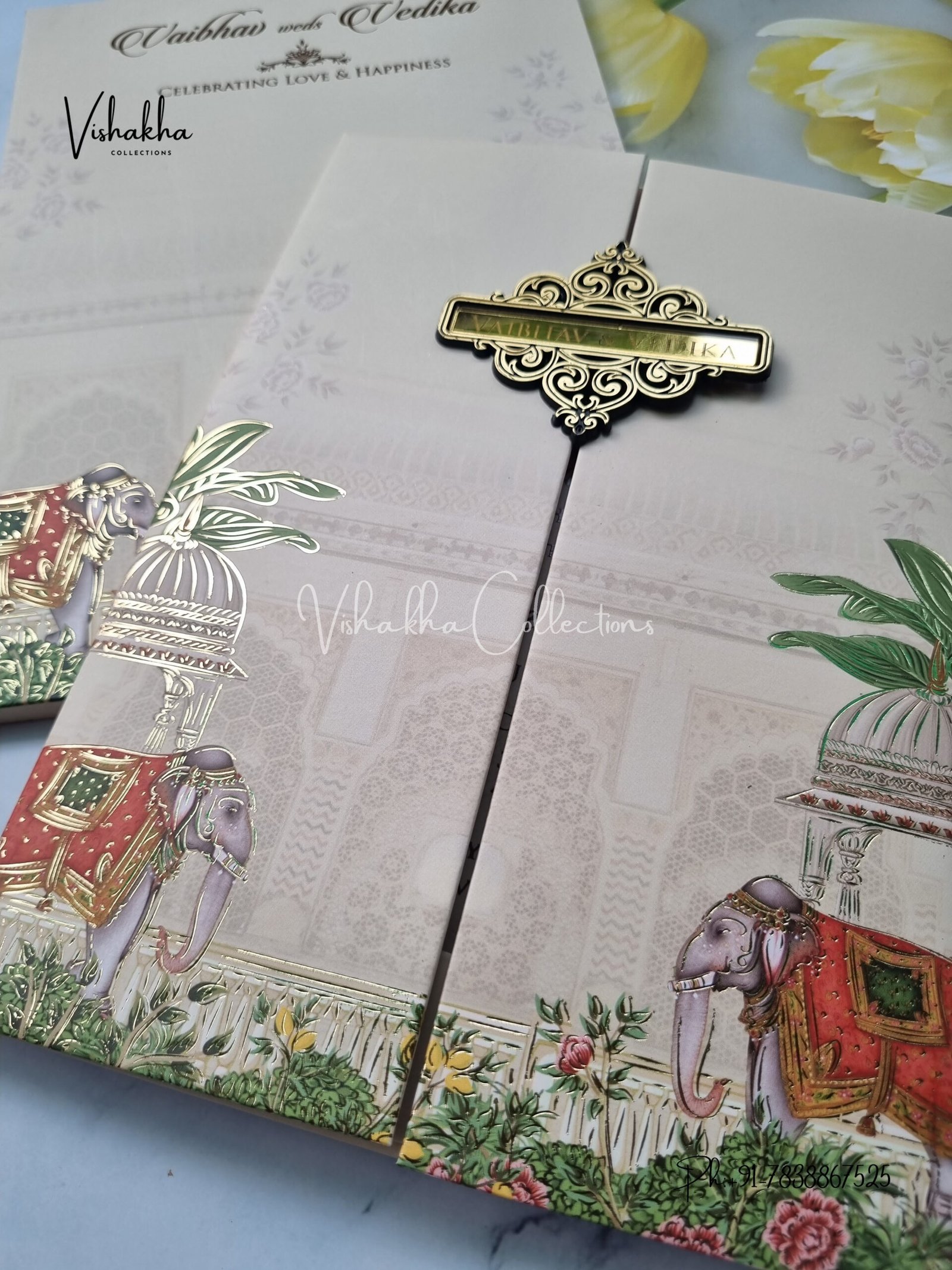 Vishakha Collections presents you beautiful luxury wedding invitation cards with all latest designs and the latest variety. Its just not a wedding invitation card but a beautiful feeling of love and relationship it carries for you. Beautifully printed and packed with a bundle of love. if you like it, dont think again, just go for it.If you are worrying about the quality of the product, send your doubts to us. We are here to help you. If you want in wholesale or bulk, dont forget to contact us.