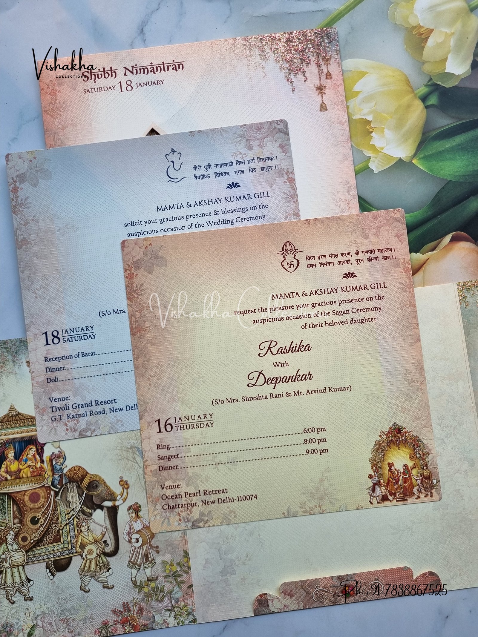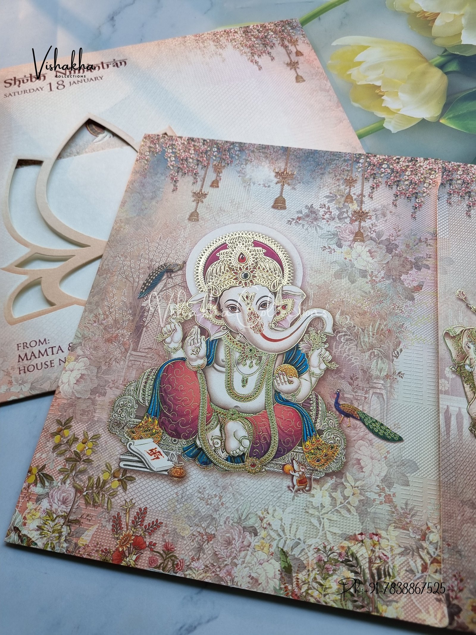 Vishakha Collections presents you beautiful luxury wedding invitation cards with all latest designs and the latest variety. Its just not a wedding invitation card but a beautiful feeling of love and relationship it carries for you. Beautifully printed and packed with a bundle of love. if you like it, dont think again, just go for it.If you are worrying about the quality of the product, send your doubts to us. We are here to help you. If you want in wholesale or bulk, dont forget to contact us.