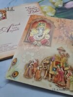 ₹30.00Peacock Barat Semi Box Ganesh Ji Hindu Yellow Brown Colored wedding invitation Cards NA-1125-29