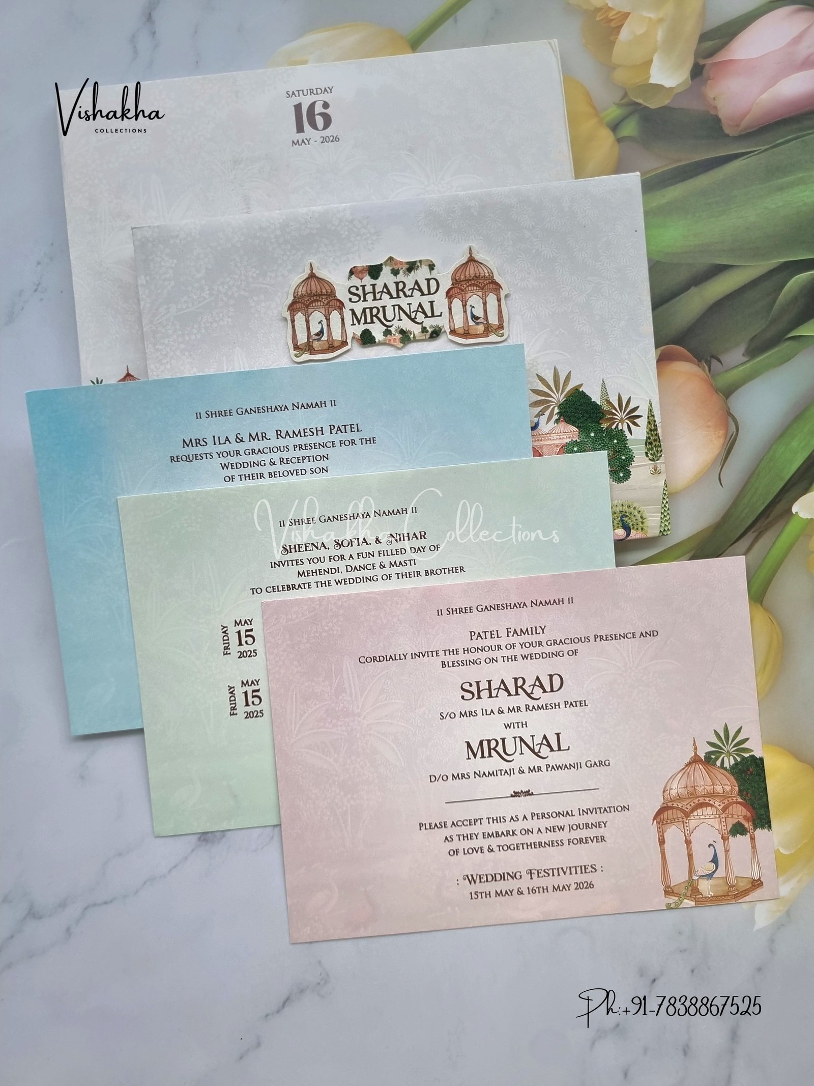 Vishakha Collections presents you beautiful luxury wedding invitation cards with all latest designs and the latest variety. Its just not a wedding invitation card but a beautiful feeling of love and relationship it carries for you. Beautifully printed and packed with a bundle of love. if you like it, dont think again, just go for it.If you are worrying about the quality of the product, send your doubts to us. We are here to help you. If you want in wholesale or bulk, dont forget to contact us.