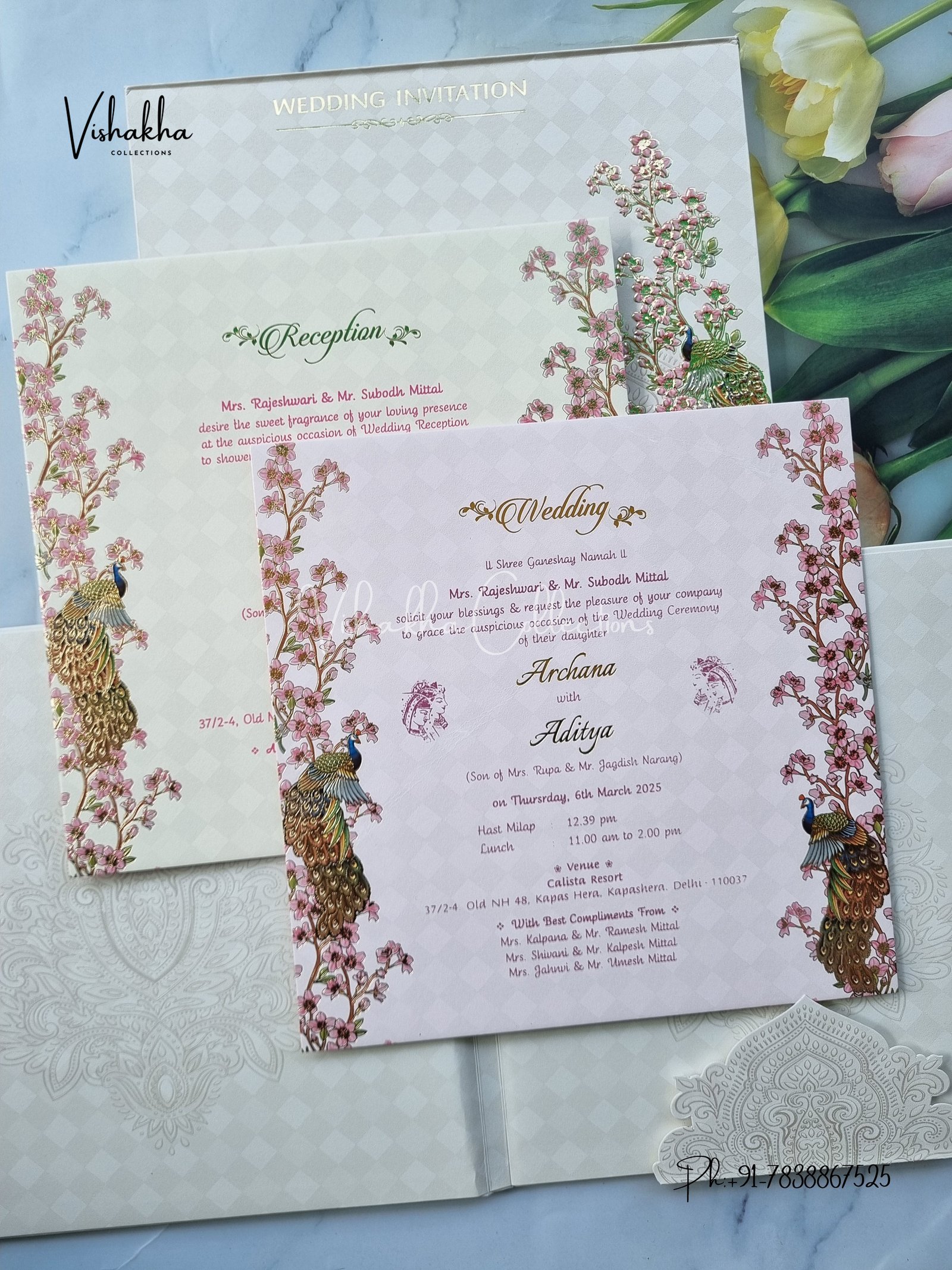 Vishakha Collections presents you beautiful luxury wedding invitation cards with all latest designs and the latest variety. Its just not a wedding invitation card but a beautiful feeling of love and relationship it carries for you. Beautifully printed and packed with a bundle of love. if you like it, dont think again, just go for it.If you are worrying about the quality of the product, send your doubts to us. We are here to help you. If you want in wholesale or bulk, dont forget to contact us.