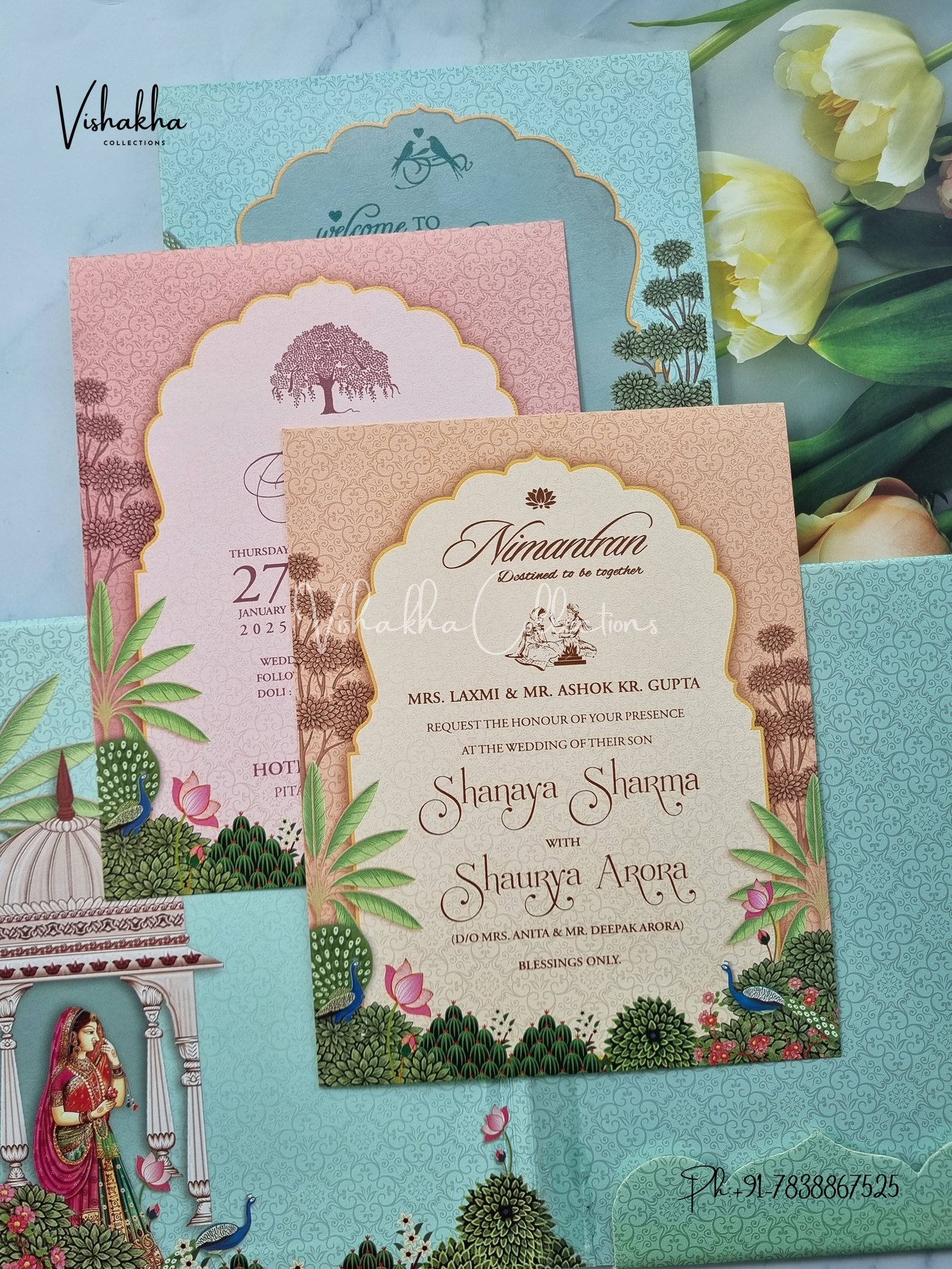 Vishakha Collections presents you beautiful luxury wedding invitation cards with all latest designs and the latest variety. Its just not a wedding invitation card but a beautiful feeling of love and relationship it carries for you. Beautifully printed and packed with a bundle of love. if you like it, dont think again, just go for it.If you are worrying about the quality of the product, send your doubts to us. We are here to help you. If you want in wholesale or bulk, dont forget to contact us.