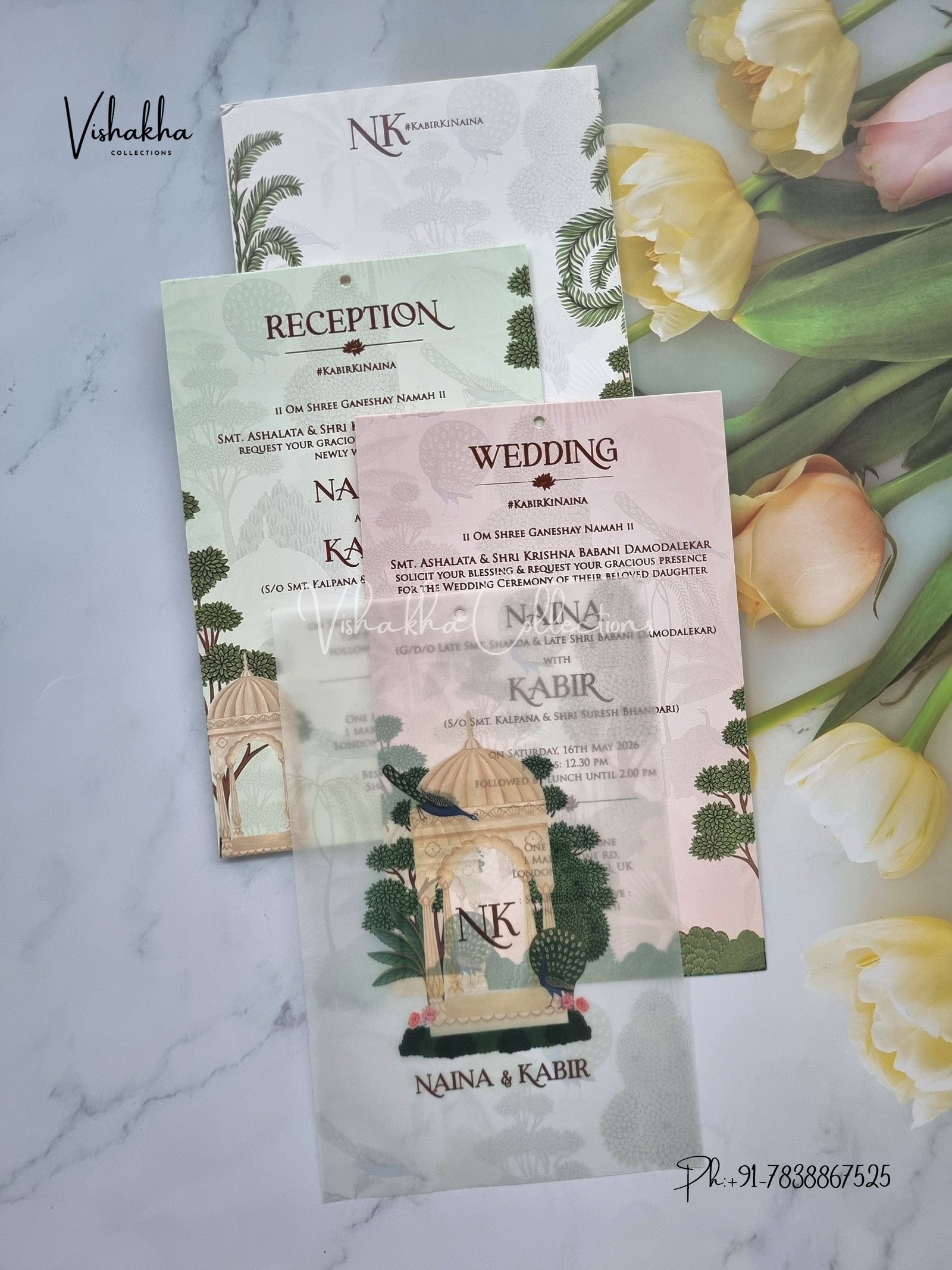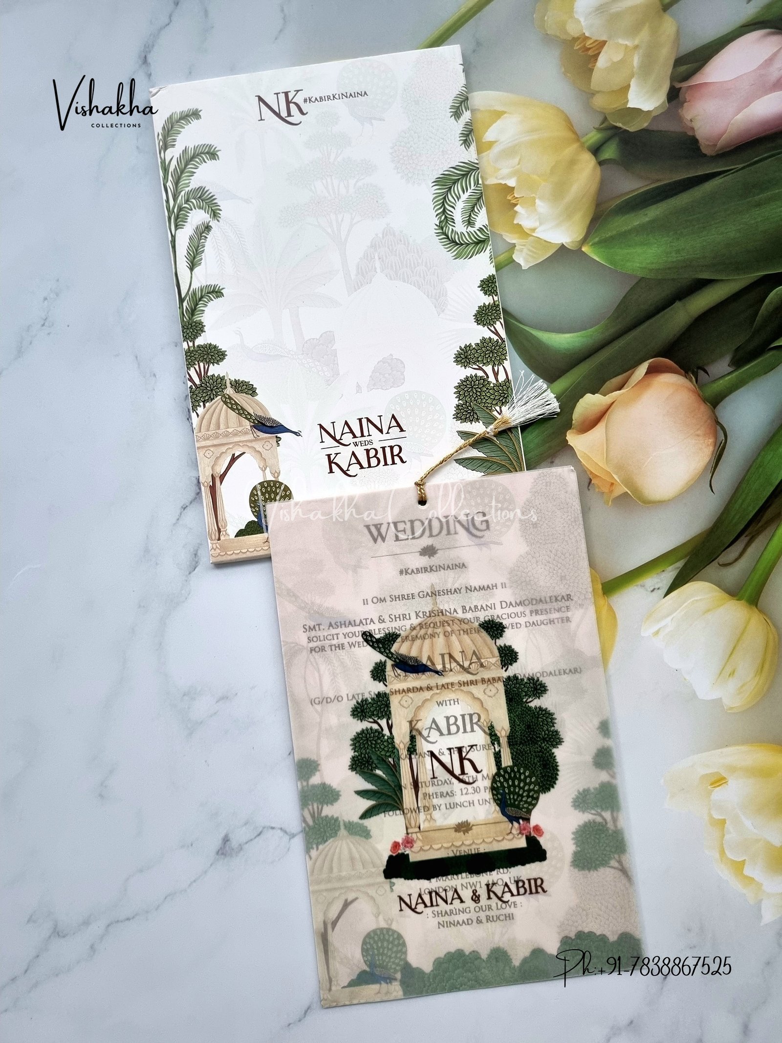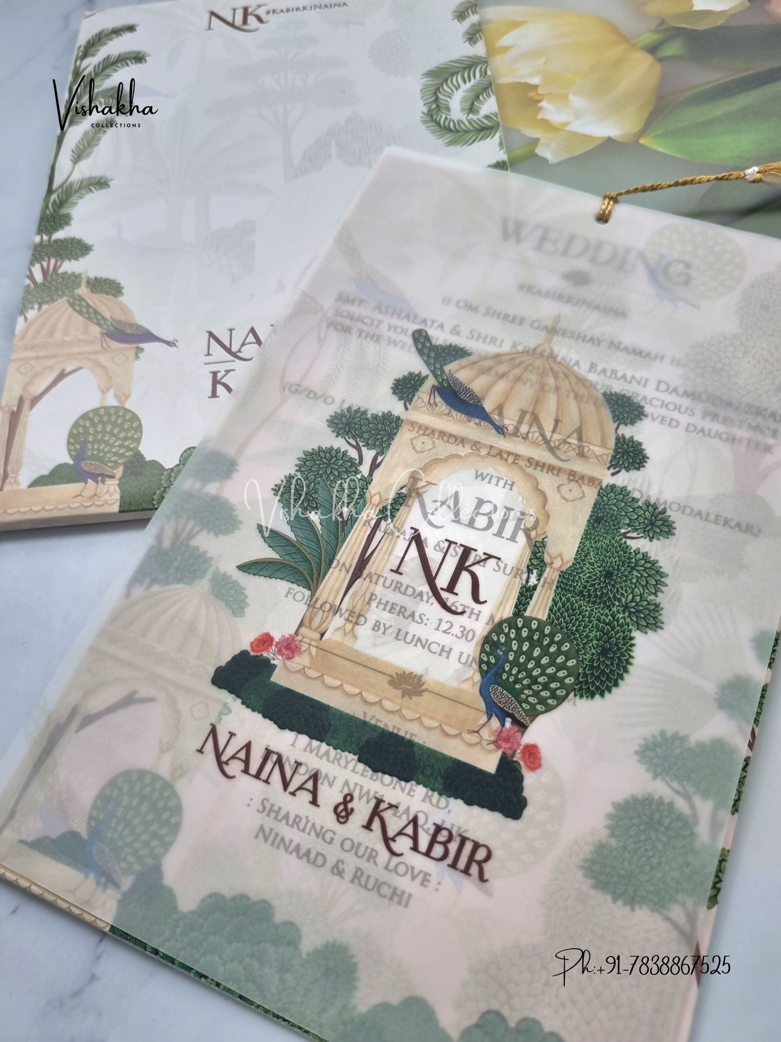 Vishakha Collections presents you beautiful luxury wedding invitation cards with all latest designs and the latest variety. Its just not a wedding invitation card but a beautiful feeling of love and relationship it carries for you. Beautifully printed and packed with a bundle of love. if you like it, dont think again, just go for it.If you are worrying about the quality of the product, send your doubts to us. We are here to help you. If you want in wholesale or bulk, dont forget to contact us.