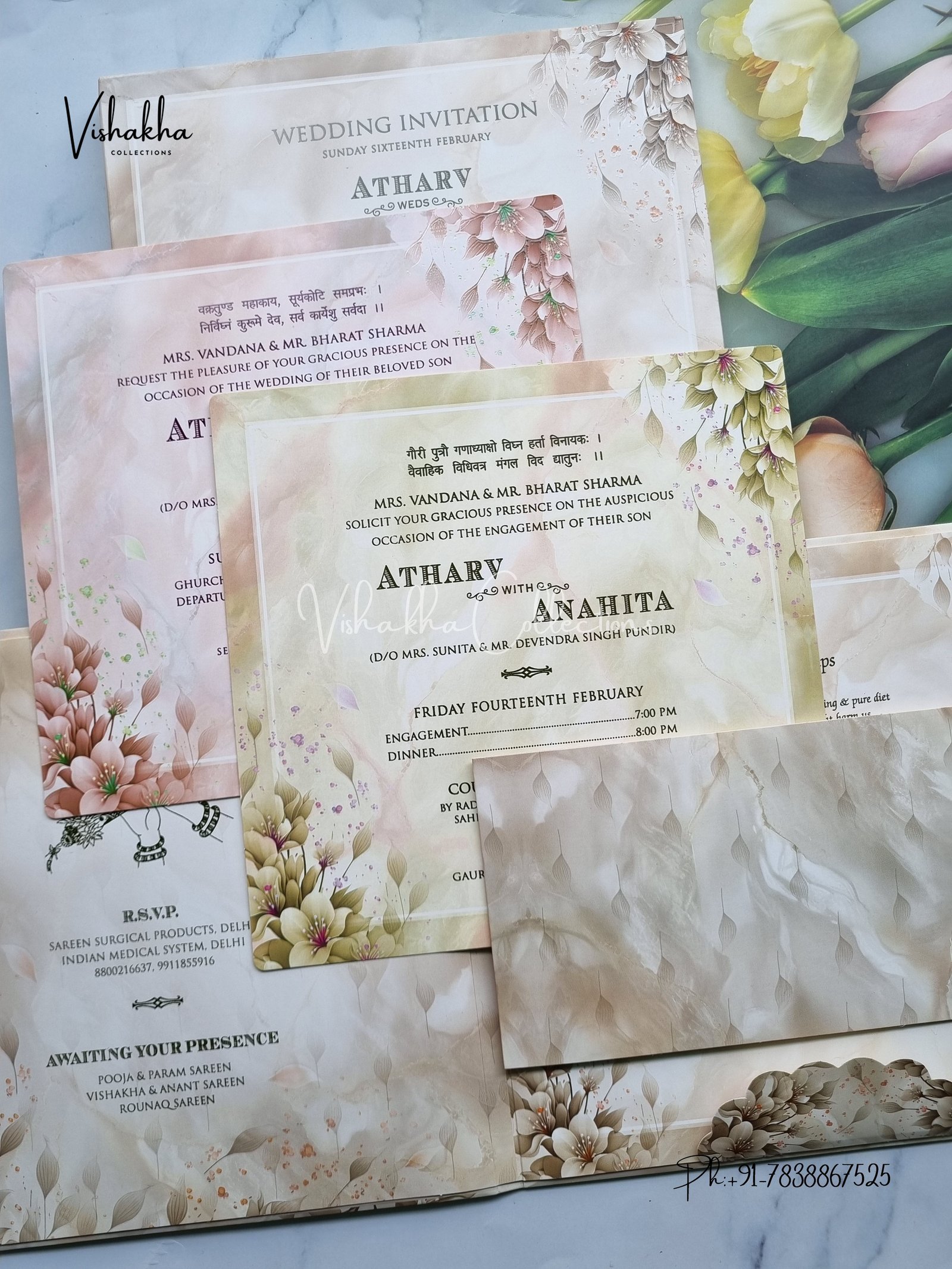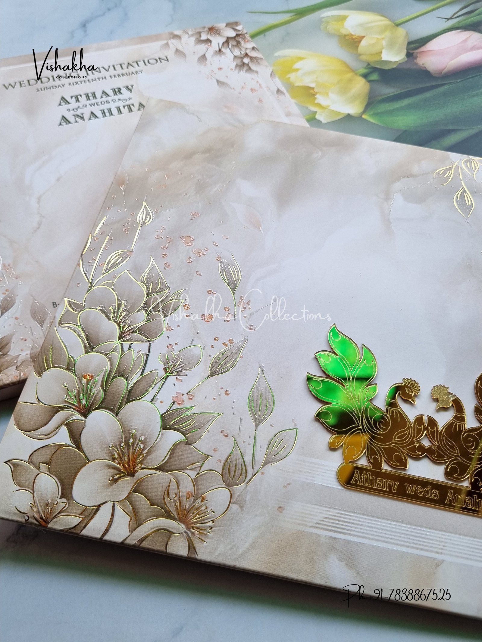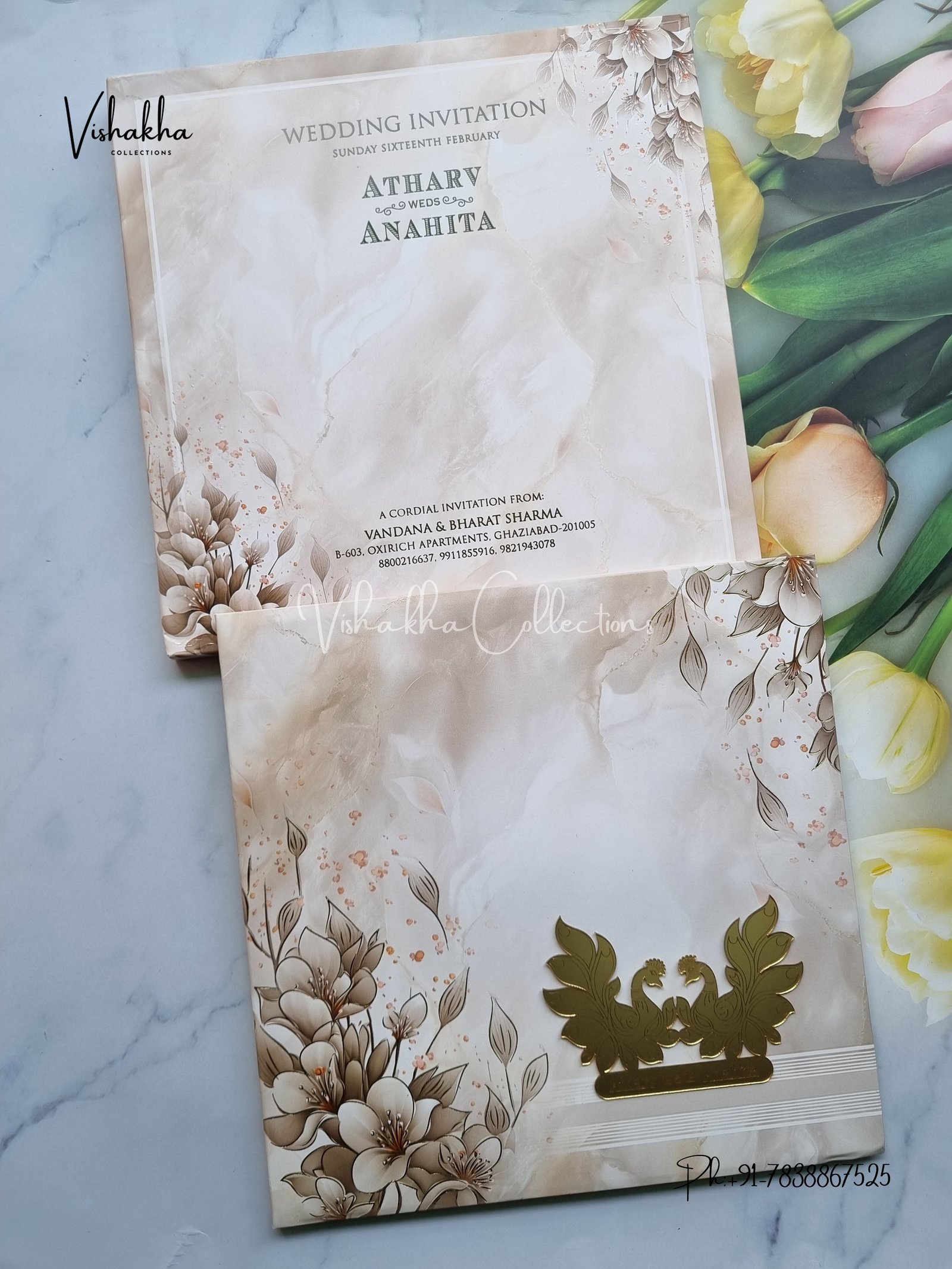 Vishakha Collections presents you beautiful luxury wedding invitation cards with all latest designs and the latest variety. Its just not a wedding invitation card but a beautiful feeling of love and relationship it carries for you. Beautifully printed and packed with a bundle of love. if you like it, dont think again, just go for it.If you are worrying about the quality of the product, send your doubts to us. We are here to help you. If you want in wholesale or bulk, dont forget to contact us.