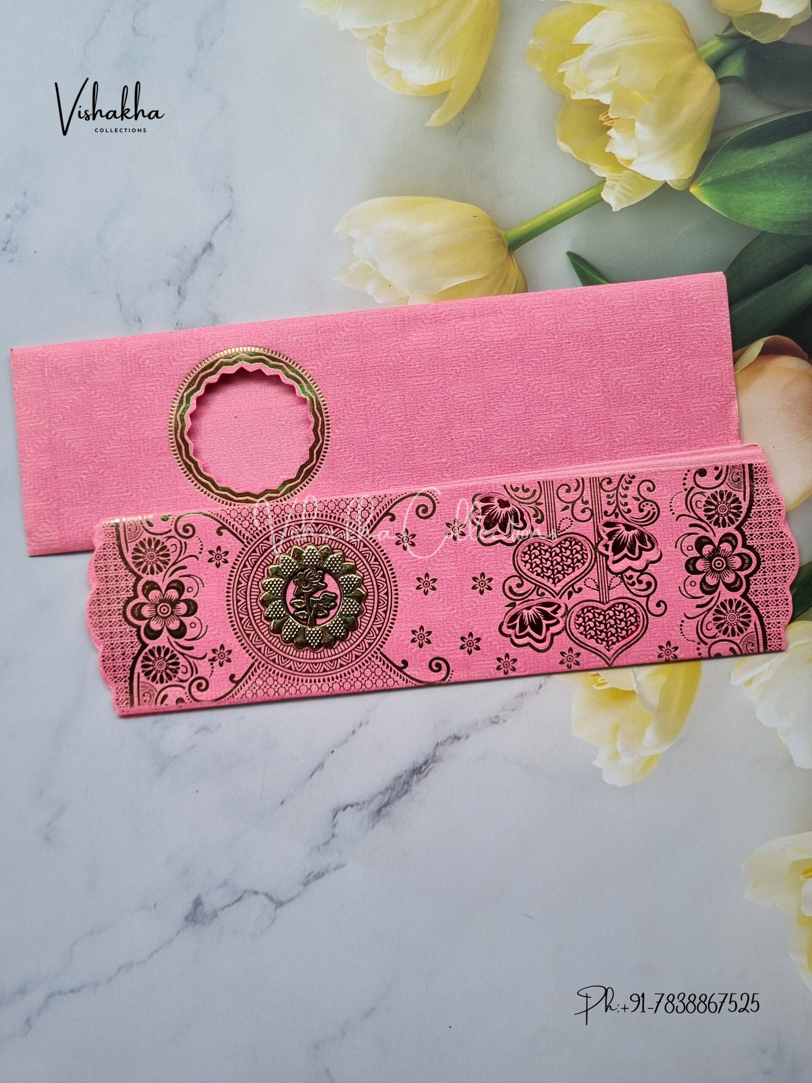 Vishakha Collections presents you beautiful luxury wedding invitation cards with all latest designs and the latest variety. Its just not a wedding invitation card but a beautiful feeling of love and relationship it carries for you. Beautifully printed and packed with a bundle of love. if you like it, dont think again, just go for it.If you are worrying about the quality of the product, send your doubts to us. We are here to help you. If you want in wholesale or bulk, dont forget to contact us.