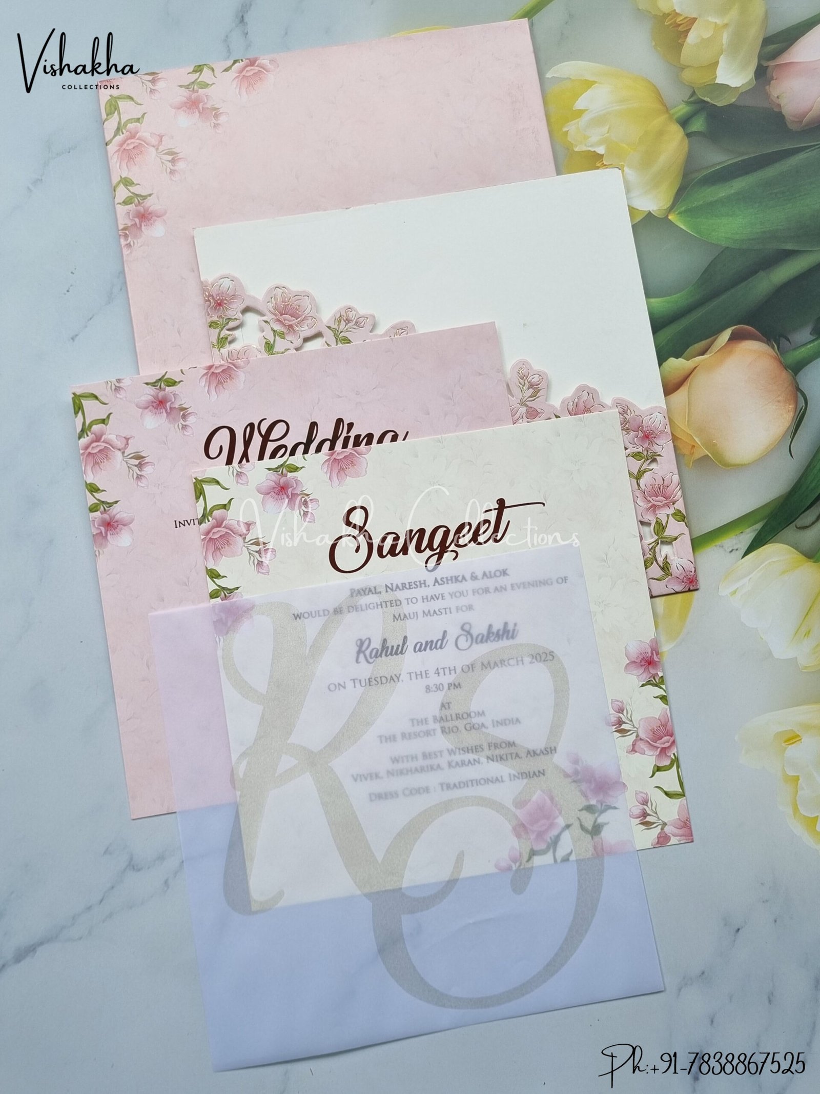 Vishakha Collections presents you beautiful luxury wedding invitation cards with all latest designs and the latest variety. Its just not a wedding invitation card but a beautiful feeling of love and relationship it carries for you. Beautifully printed and packed with a bundle of love. if you like it, dont think again, just go for it.If you are worrying about the quality of the product, send your doubts to us. We are here to help you. If you want in wholesale or bulk, dont forget to contact us.