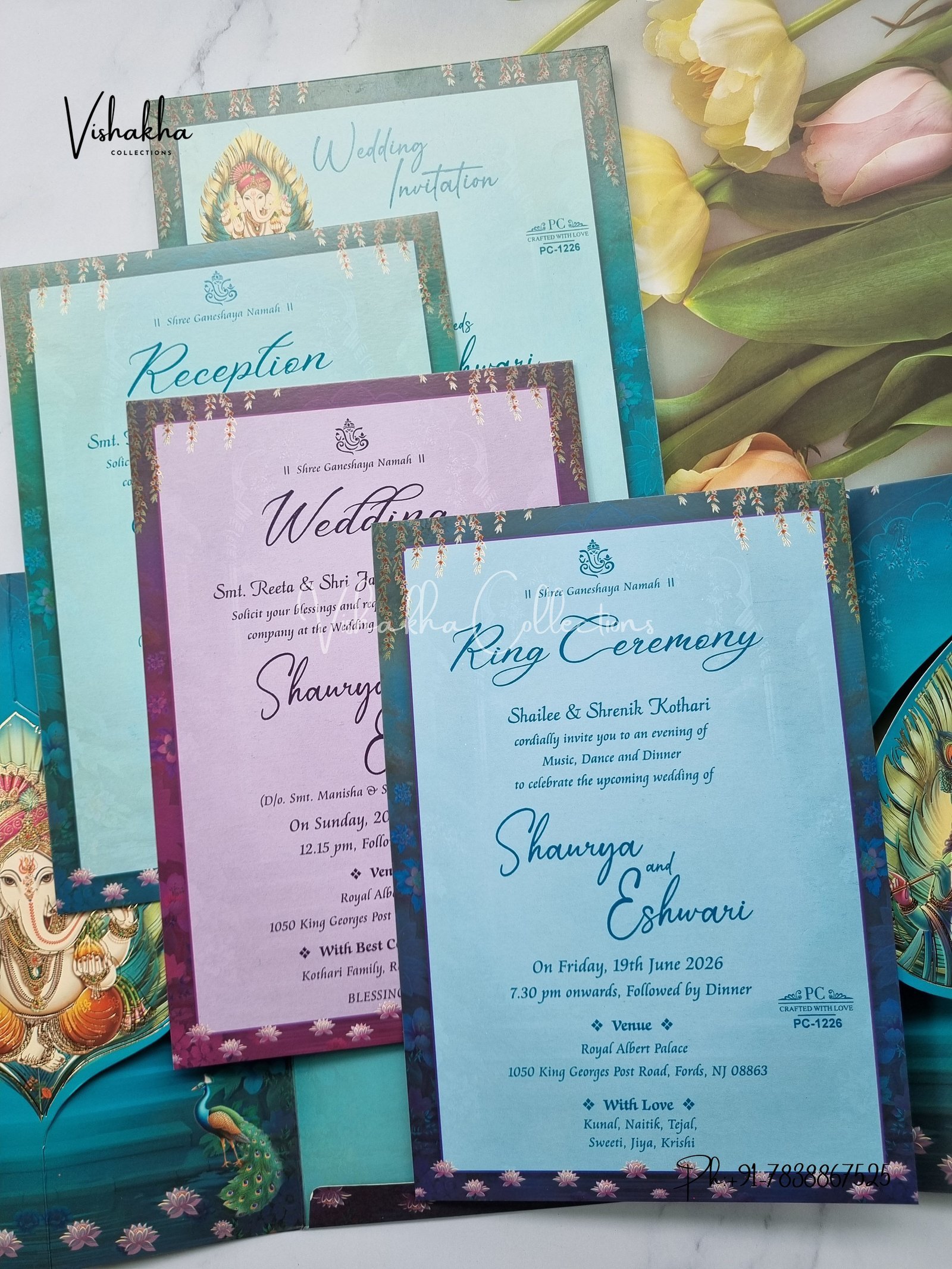 Vishakha Collections presents you beautiful luxury wedding invitation cards with all latest designs and the latest variety. Its just not a wedding invitation card but a beautiful feeling of love and relationship it carries for you. Beautifully printed and packed with a bundle of love. if you like it, dont think again, just go for it.If you are worrying about the quality of the product, send your doubts to us. We are here to help you. If you want in wholesale or bulk, dont forget to contact us.