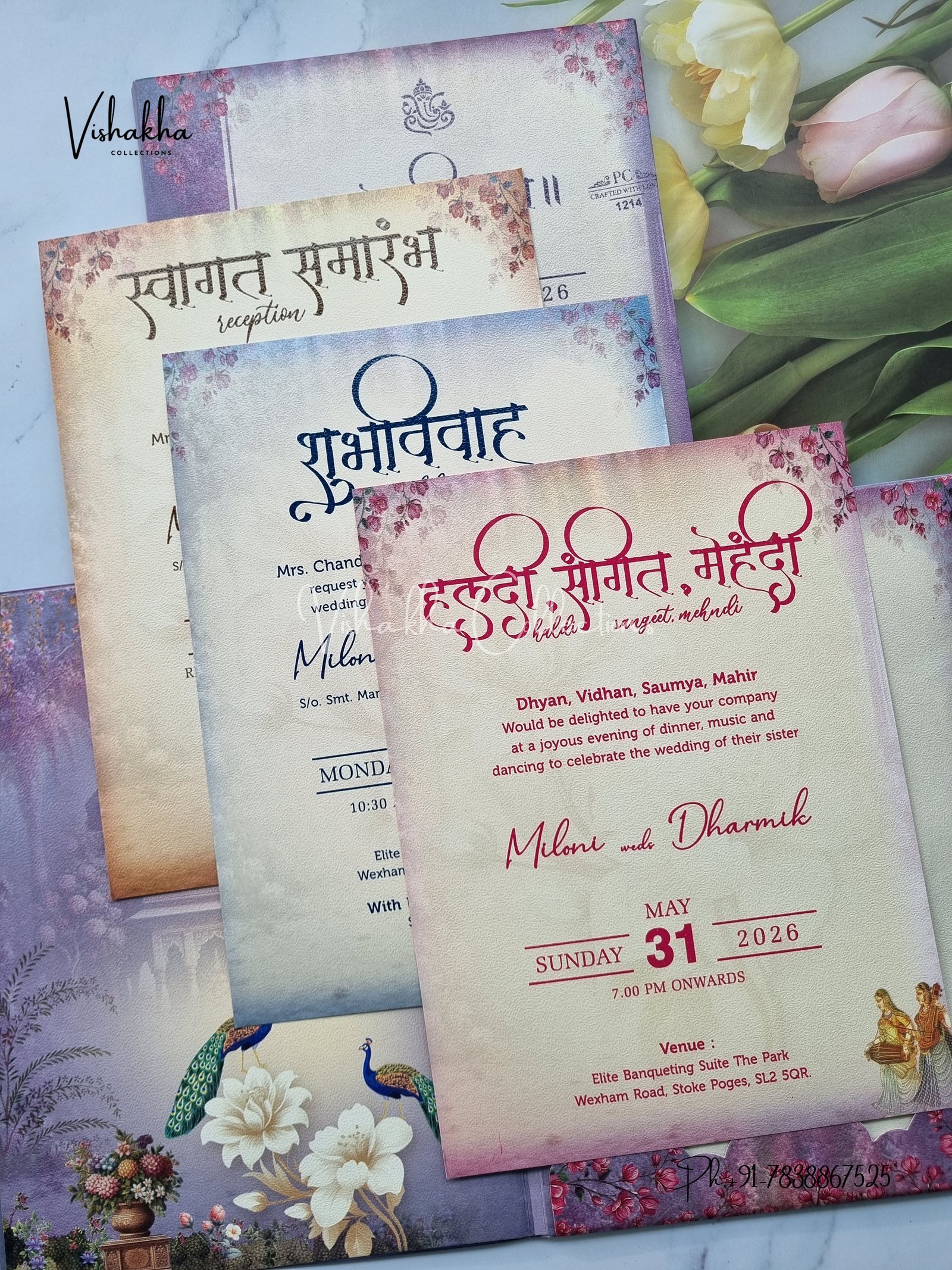 Vishakha Collections presents you beautiful luxury wedding invitation cards with all latest designs and the latest variety. Its just not a wedding invitation card but a beautiful feeling of love and relationship it carries for you. Beautifully printed and packed with a bundle of love. if you like it, dont think again, just go for it.If you are worrying about the quality of the product, send your doubts to us. We are here to help you. If you want in wholesale or bulk, dont forget to contact us.
