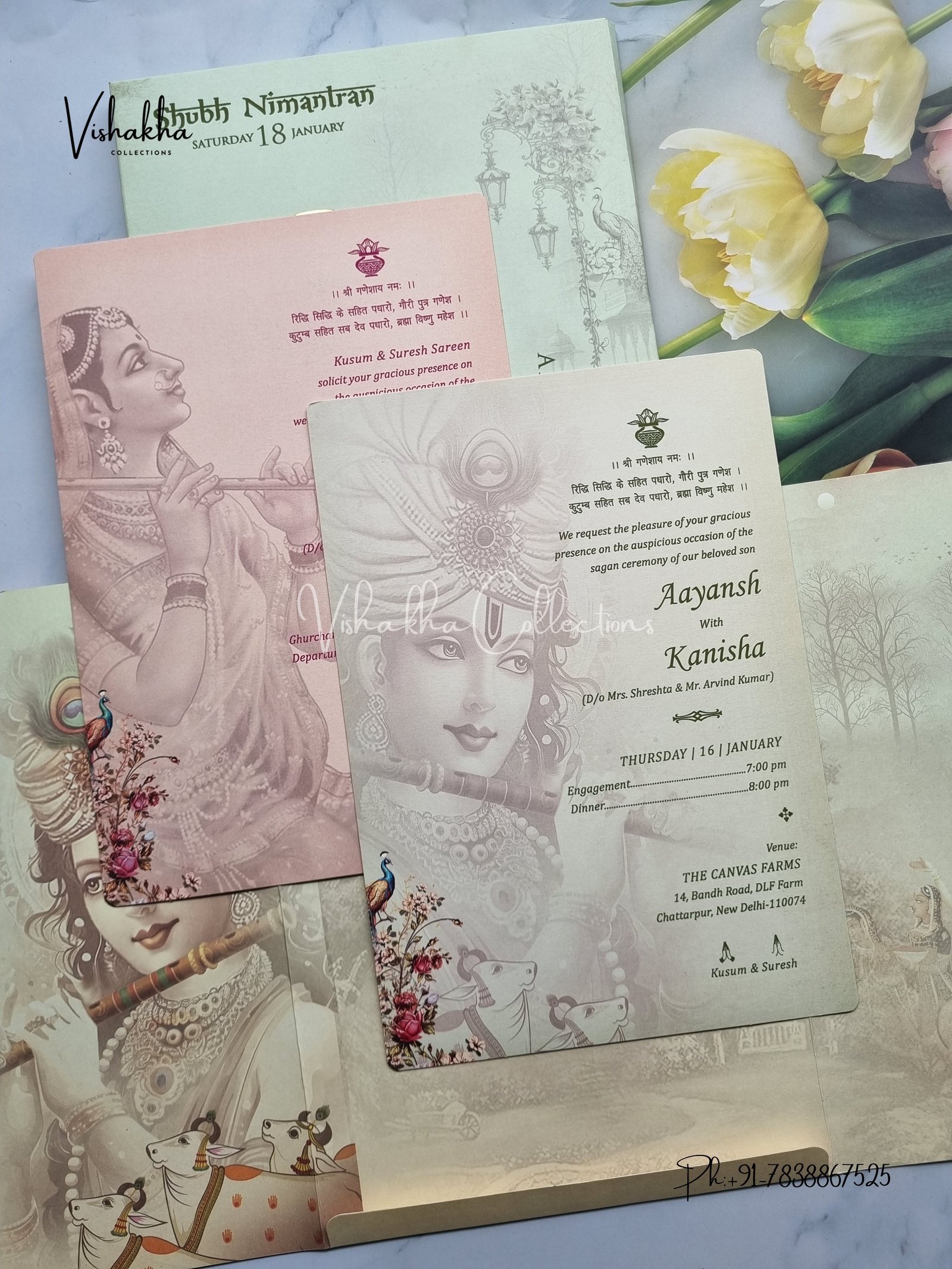 Vishakha Collections presents you beautiful luxury wedding invitation cards with all latest designs and the latest variety. Its just not a wedding invitation card but a beautiful feeling of love and relationship it carries for you. Beautifully printed and packed with a bundle of love. if you like it, dont think again, just go for it.If you are worrying about the quality of the product, send your doubts to us. We are here to help you. If you want in wholesale or bulk, dont forget to contact us.