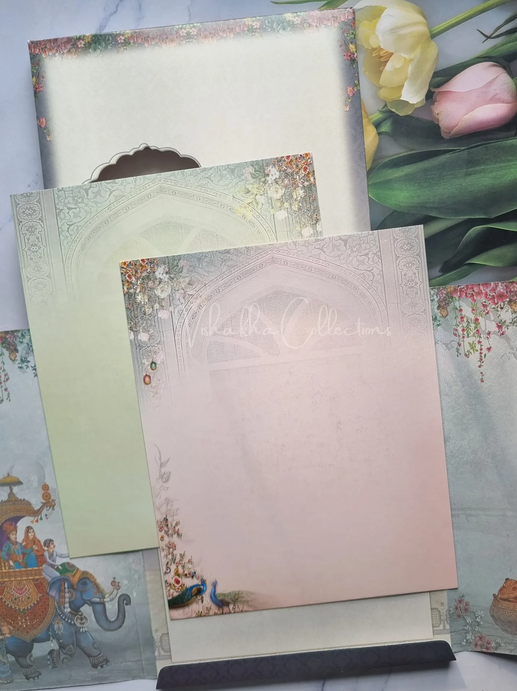 Vishakha Collections presents you beautiful luxury wedding invitation cards with all latest designs and the latest variety. Its just not a wedding invitation card but a beautiful feeling of love and relationship it carries for you. Beautifully printed and packed with a bundle of love. if you like it, dont think again, just go for it.If you are worrying about the quality of the product, send your doubts to us. We are here to help you. If you want in wholesale or bulk, dont forget to contact us.
