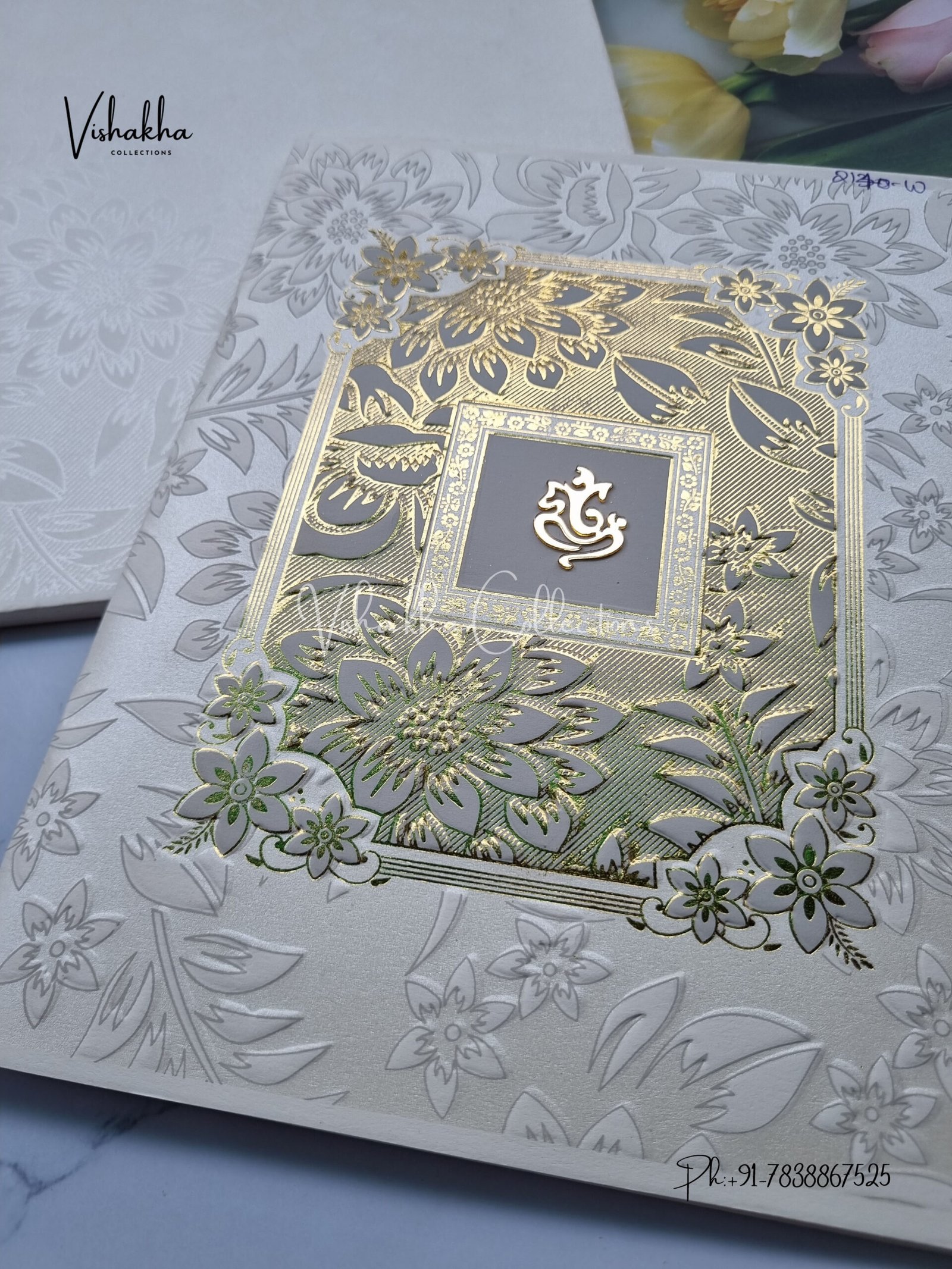 ₹28.00Rich White and Gold with Grey Flower Pattern wedding card