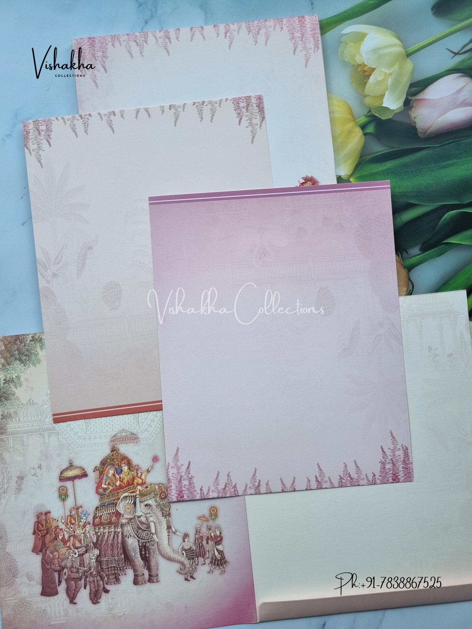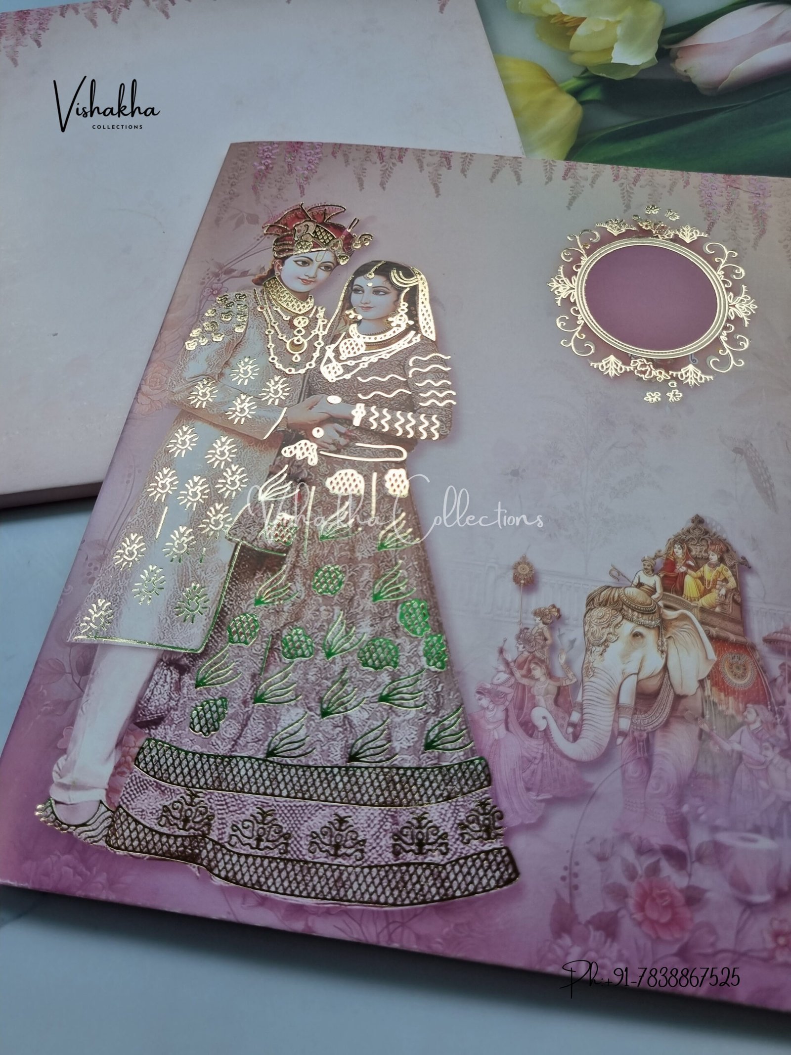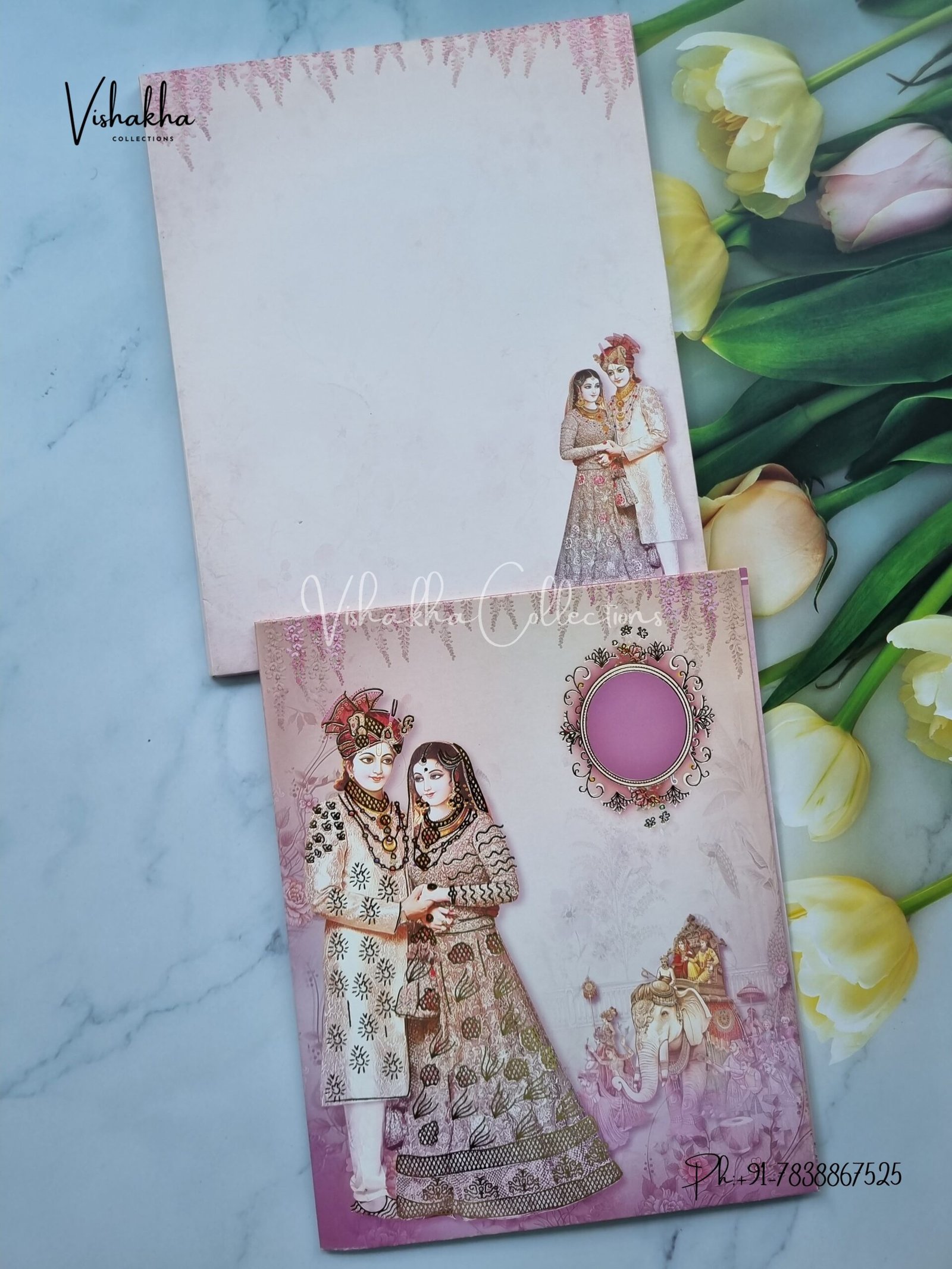 Vishakha Collections presents you beautiful luxury wedding invitation cards with all latest designs and the latest variety. Its just not a wedding invitation card but a beautiful feeling of love and relationship it carries for you. Beautifully printed and packed with a bundle of love. if you like it, dont think again, just go for it.If you are worrying about the quality of the product, send your doubts to us. We are here to help you. If you want in wholesale or bulk, dont forget to contact us.