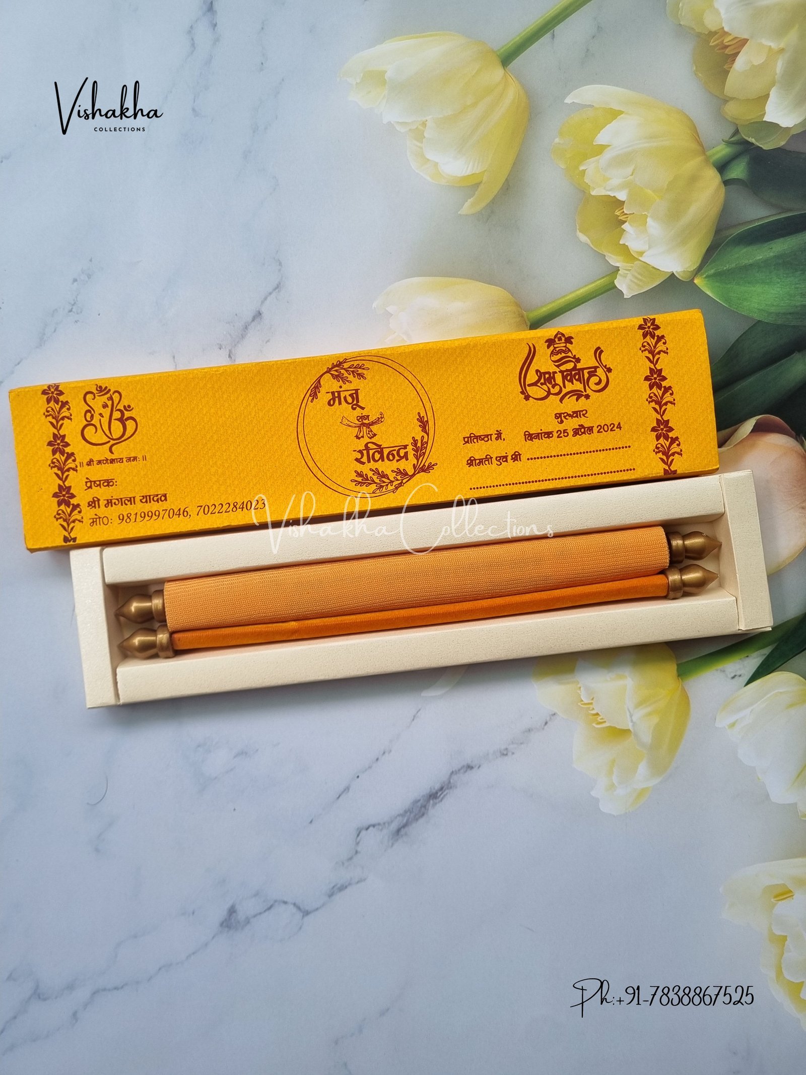 Vishakha Collections presents you beautiful luxury wedding invitation cards with all latest designs and the latest variety. Its just not a wedding invitation card but a beautiful feeling of love and relationship it carries for you. Beautifully printed and packed with a bundle of love. if you like it, dont think again, just go for it.If you are worrying about the quality of the product, send your doubts to us. We are here to help you. If you want in wholesale or bulk, dont forget to contact us.