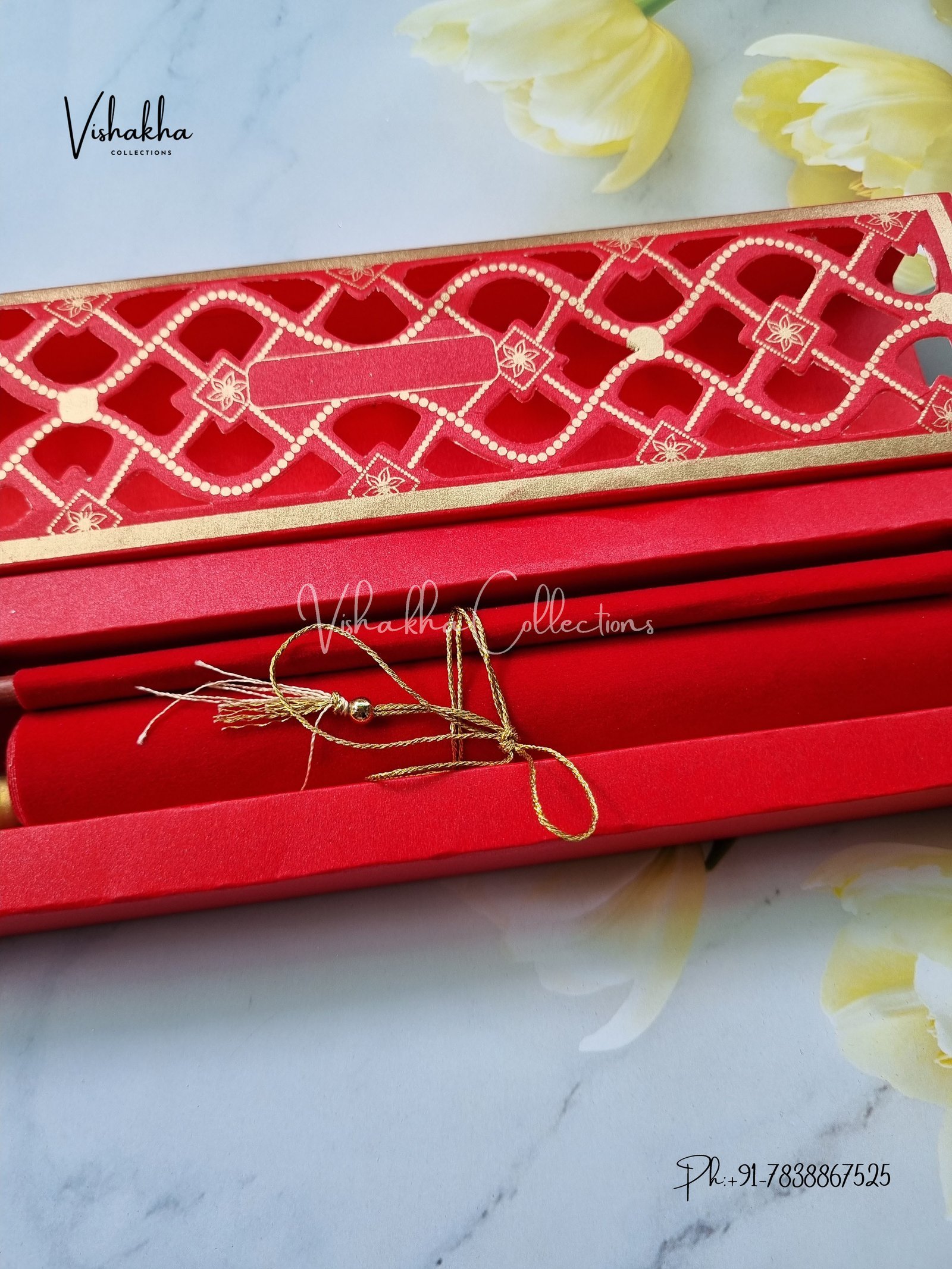 Vishakha Collections presents you beautiful luxury wedding invitation cards with all latest designs and the latest variety. Its just not a wedding invitation card but a beautiful feeling of love and relationship it carries for you. Beautifully printed and packed with a bundle of love. if you like it, dont think again, just go for it.If you are worrying about the quality of the product, send your doubts to us. We are here to help you. If you want in wholesale or bulk, dont forget to contact us.