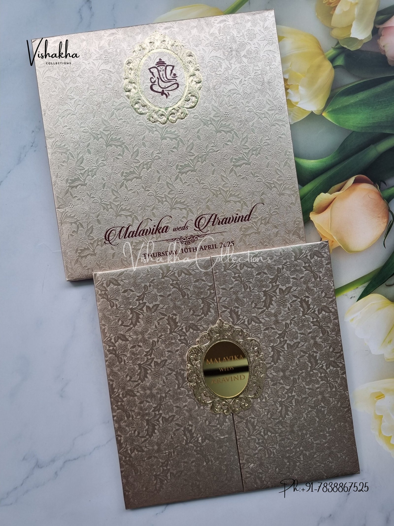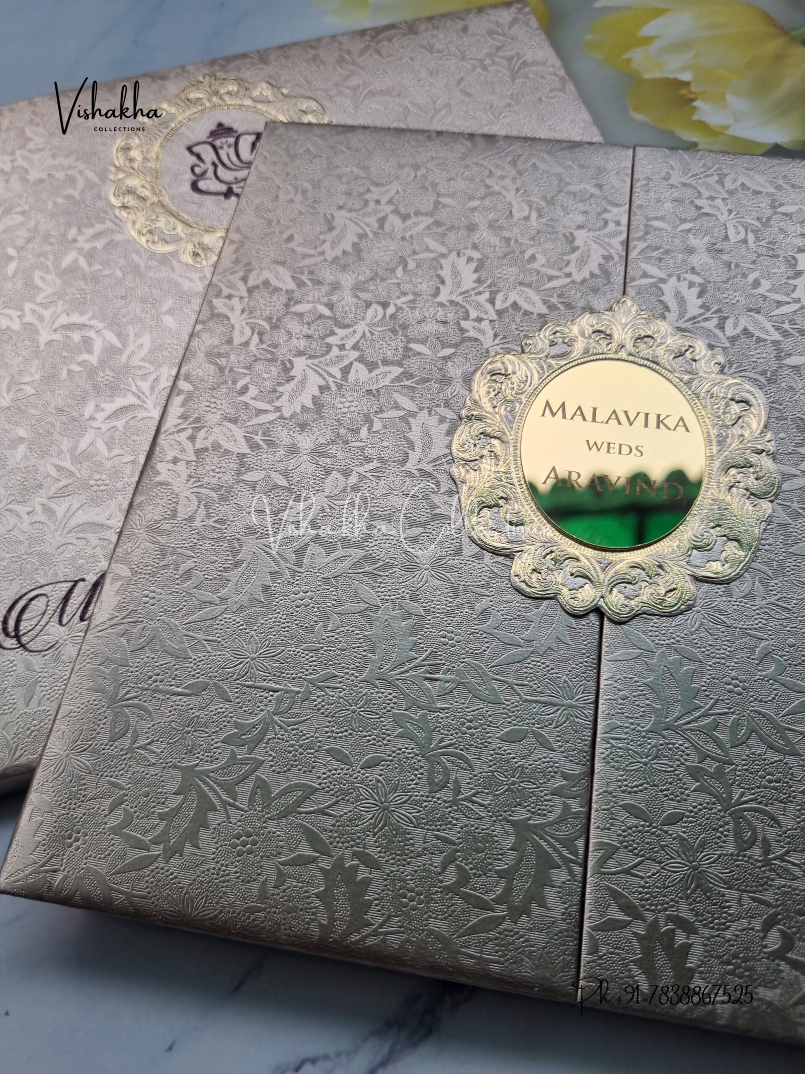 Vishakha Collections presents you beautiful luxury wedding invitation cards with all latest designs and the latest variety. Its just not a wedding invitation card but a beautiful feeling of love and relationship it carries for you. Beautifully printed and packed with a bundle of love. if you like it, dont think again, just go for it.If you are worrying about the quality of the product, send your doubts to us. We are here to help you. If you want in wholesale or bulk, dont forget to contact us.