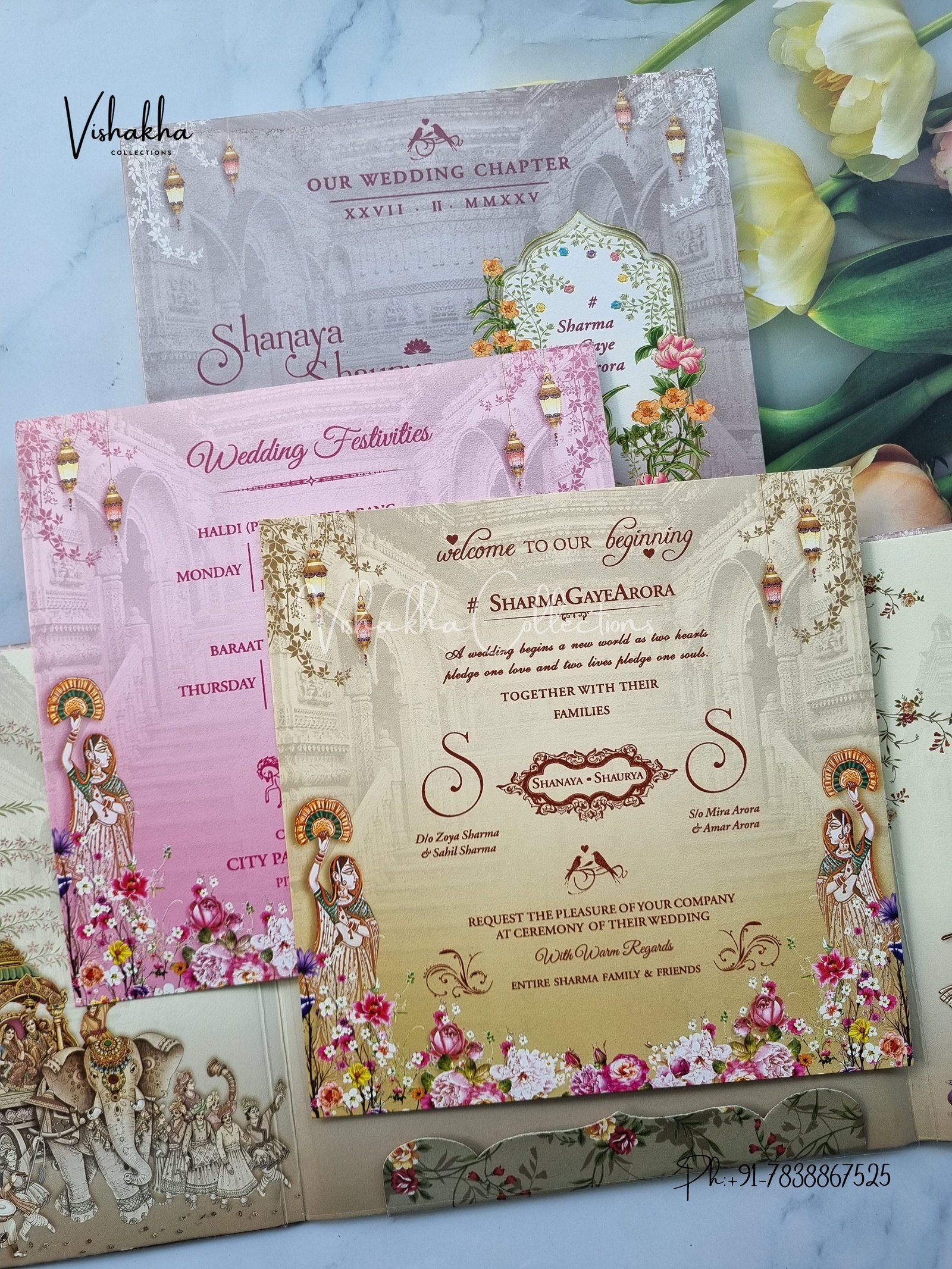 Vishakha Collections presents you beautiful luxury wedding invitation cards with all latest designs and the latest variety. Its just not a wedding invitation card but a beautiful feeling of love and relationship it carries for you. Beautifully printed and packed with a bundle of love. if you like it, dont think again, just go for it.If you are worrying about the quality of the product, send your doubts to us. We are here to help you. If you want in wholesale or bulk, dont forget to contact us.