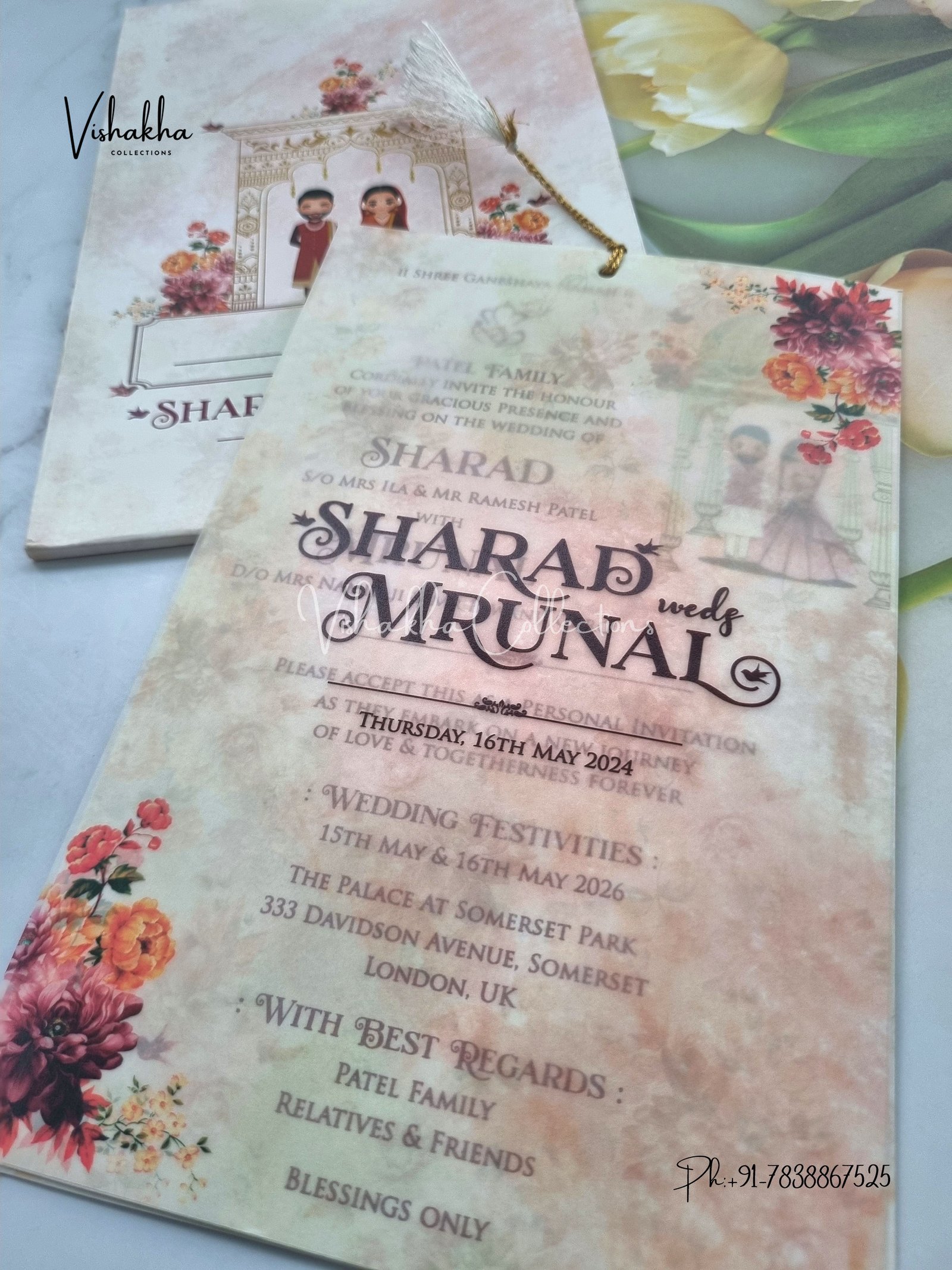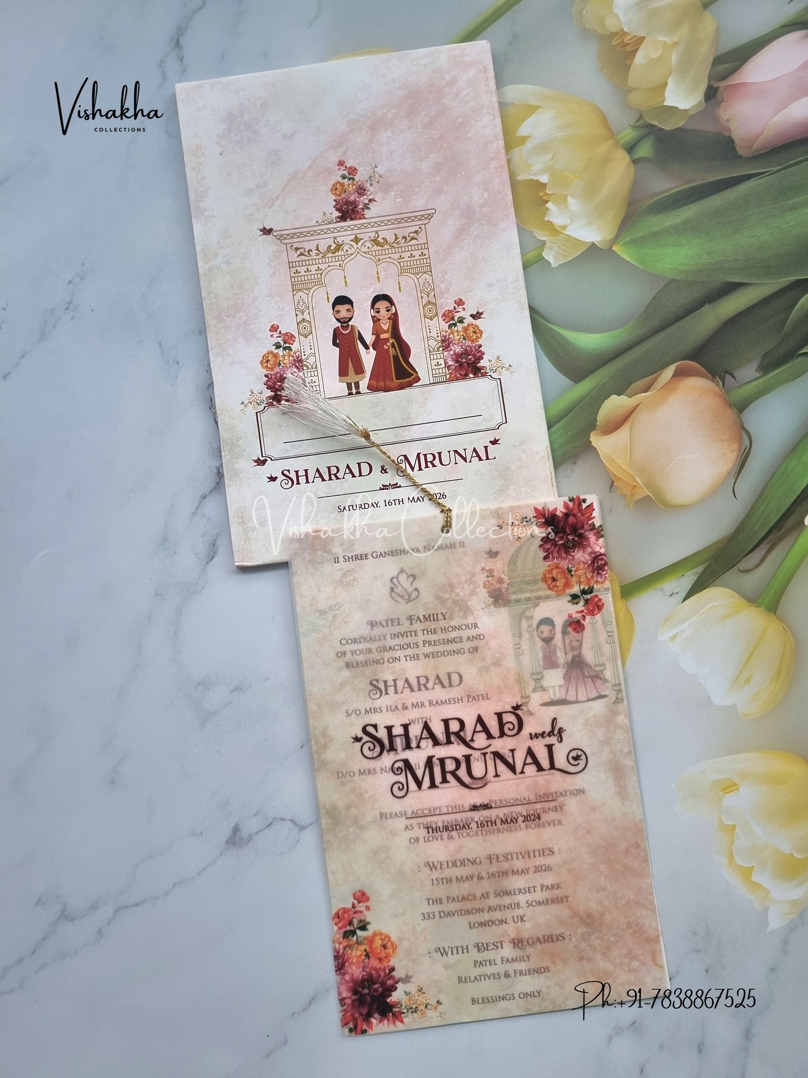 Vishakha Collections presents you beautiful luxury wedding invitation cards with all latest designs and the latest variety. Its just not a wedding invitation card but a beautiful feeling of love and relationship it carries for you. Beautifully printed and packed with a bundle of love. if you like it, dont think again, just go for it.If you are worrying about the quality of the product, send your doubts to us. We are here to help you. If you want in wholesale or bulk, dont forget to contact us.