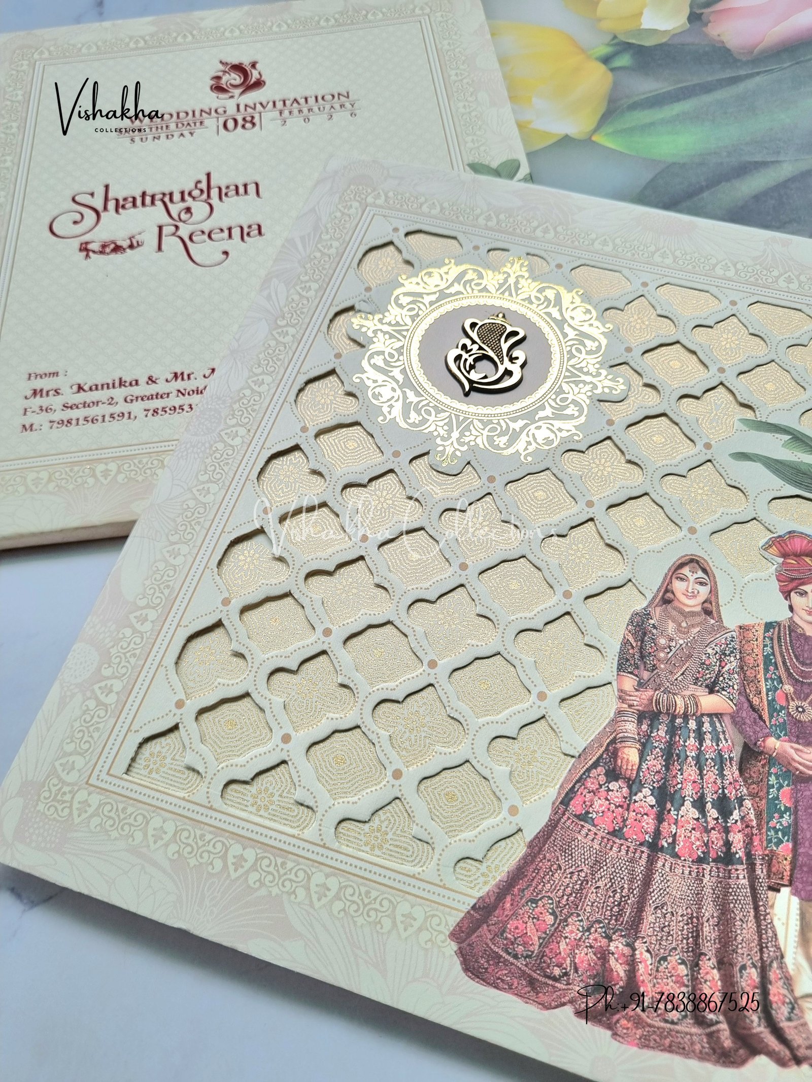 Semi Box Hindu Muslim Christian Jain Sikh Cream Colored wedding invitation Cards NA-1125-145