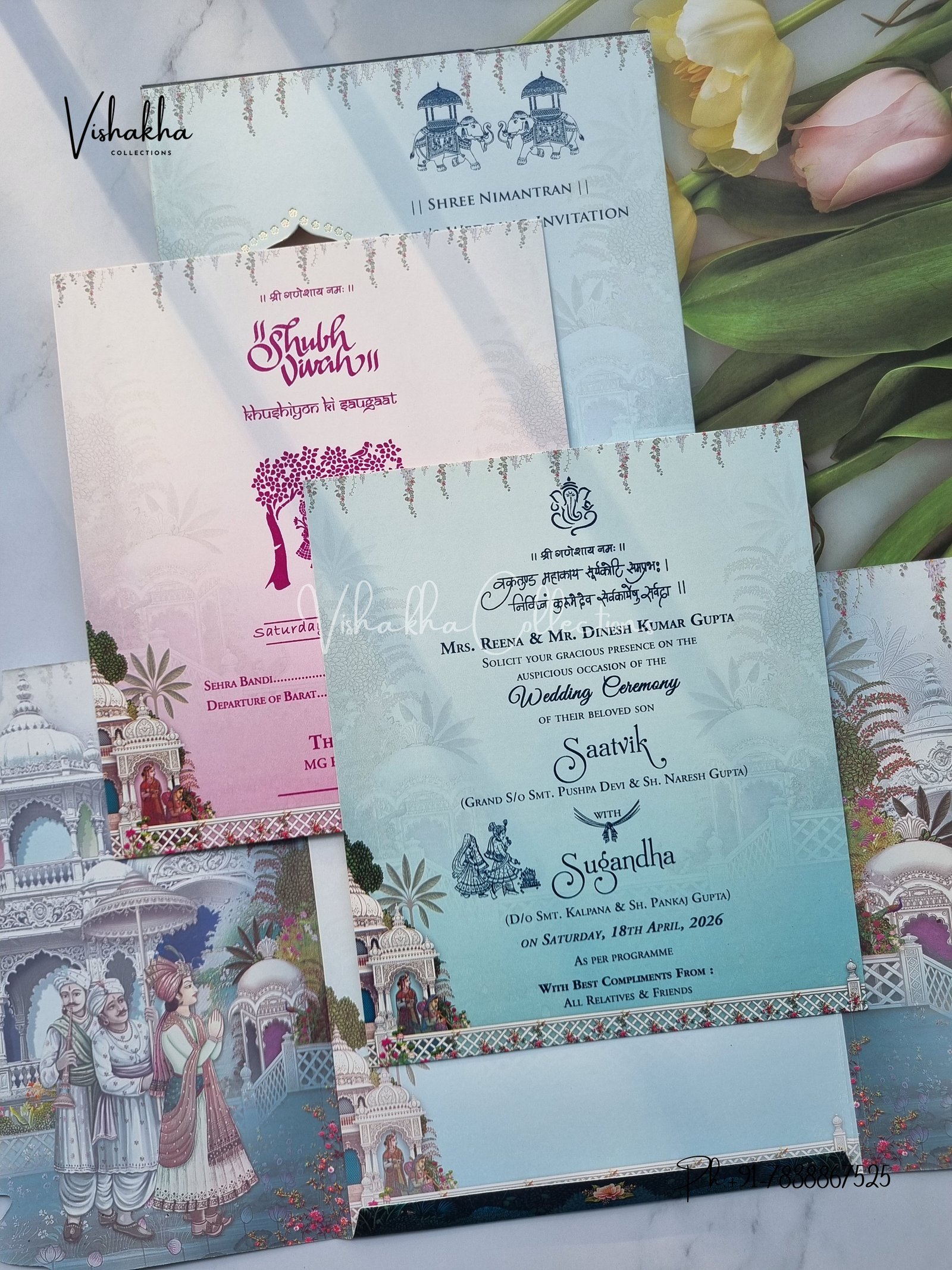 Vishakha Collections presents you beautiful luxury wedding invitation cards with all latest designs and the latest variety. Its just not a wedding invitation card but a beautiful feeling of love and relationship it carries for you. Beautifully printed and packed with a bundle of love. if you like it, dont think again, just go for it.If you are worrying about the quality of the product, send your doubts to us. We are here to help you. If you want in wholesale or bulk, dont forget to contact us.