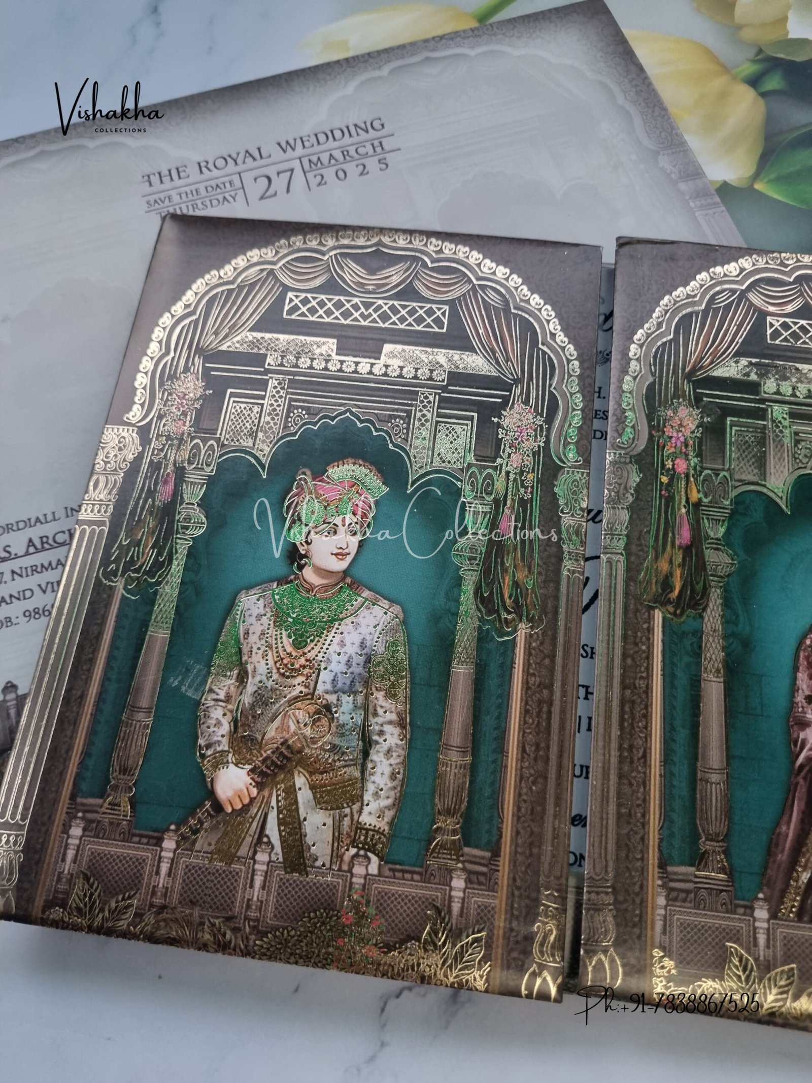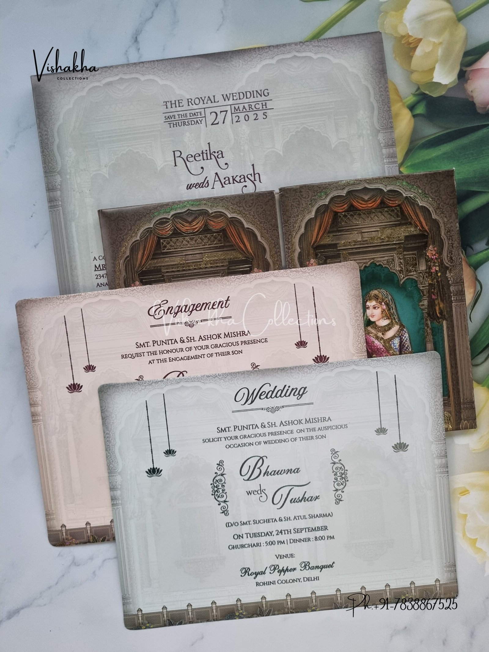 Vishakha Collections presents you beautiful luxury wedding invitation cards with all latest designs and the latest variety. Its just not a wedding invitation card but a beautiful feeling of love and relationship it carries for you. Beautifully printed and packed with a bundle of love. if you like it, dont think again, just go for it.If you are worrying about the quality of the product, send your doubts to us. We are here to help you. If you want in wholesale or bulk, dont forget to contact us.