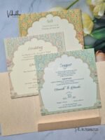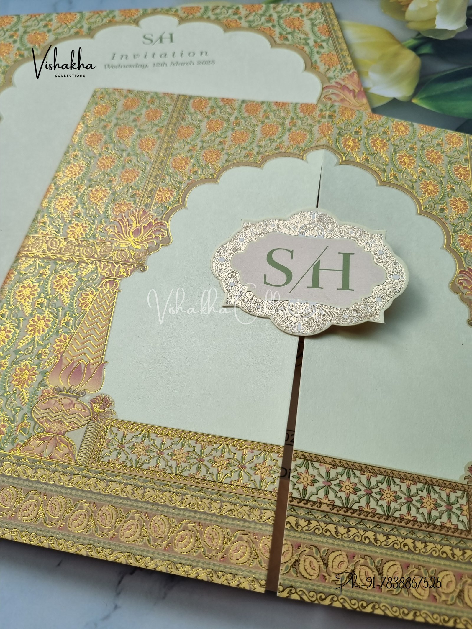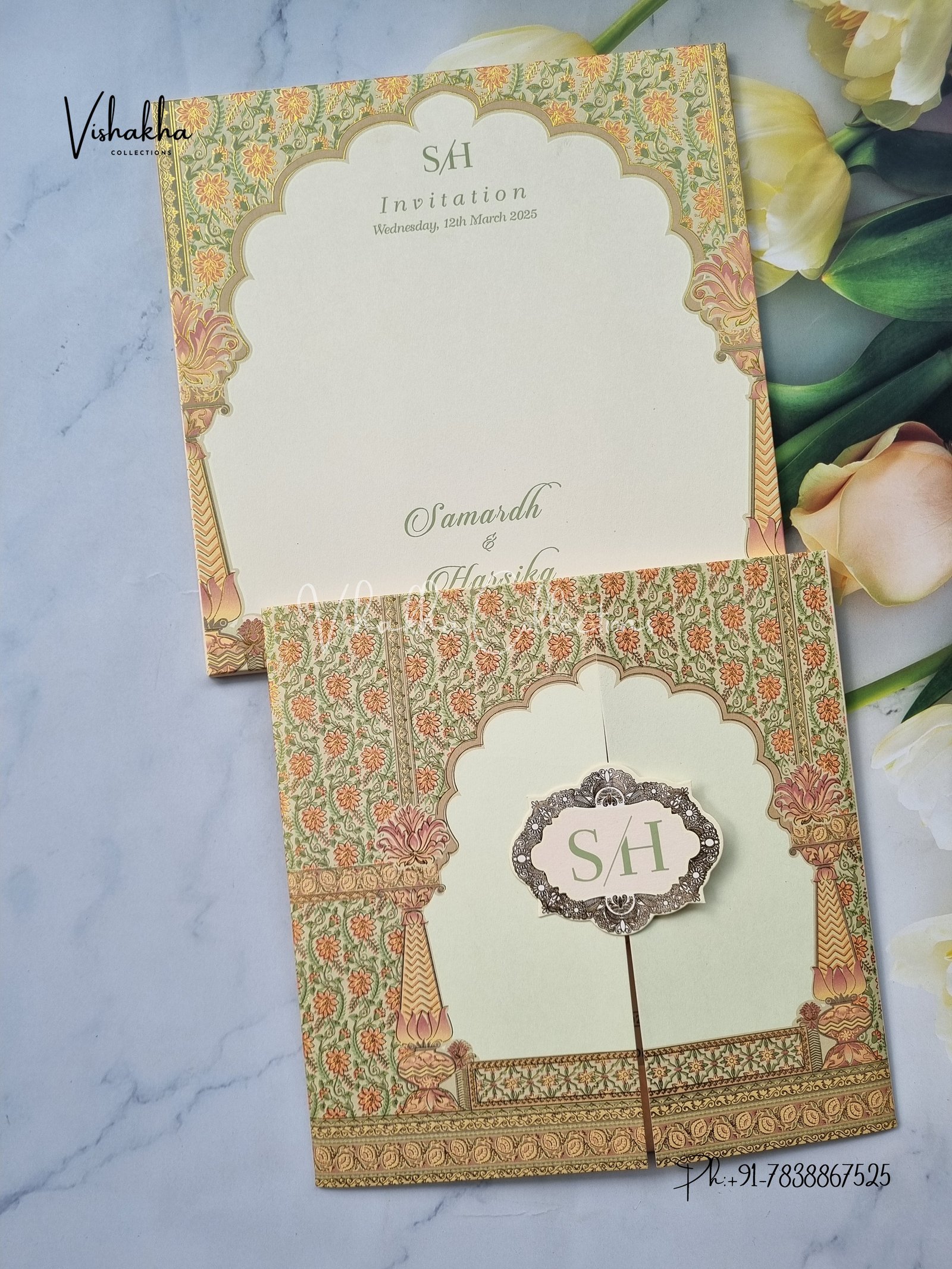 Vishakha Collections presents you beautiful luxury wedding invitation cards with all latest designs and the latest variety. Its just not a wedding invitation card but a beautiful feeling of love and relationship it carries for you. Beautifully printed and packed with a bundle of love. if you like it, dont think again, just go for it.If you are worrying about the quality of the product, send your doubts to us. We are here to help you. If you want in wholesale or bulk, dont forget to contact us.