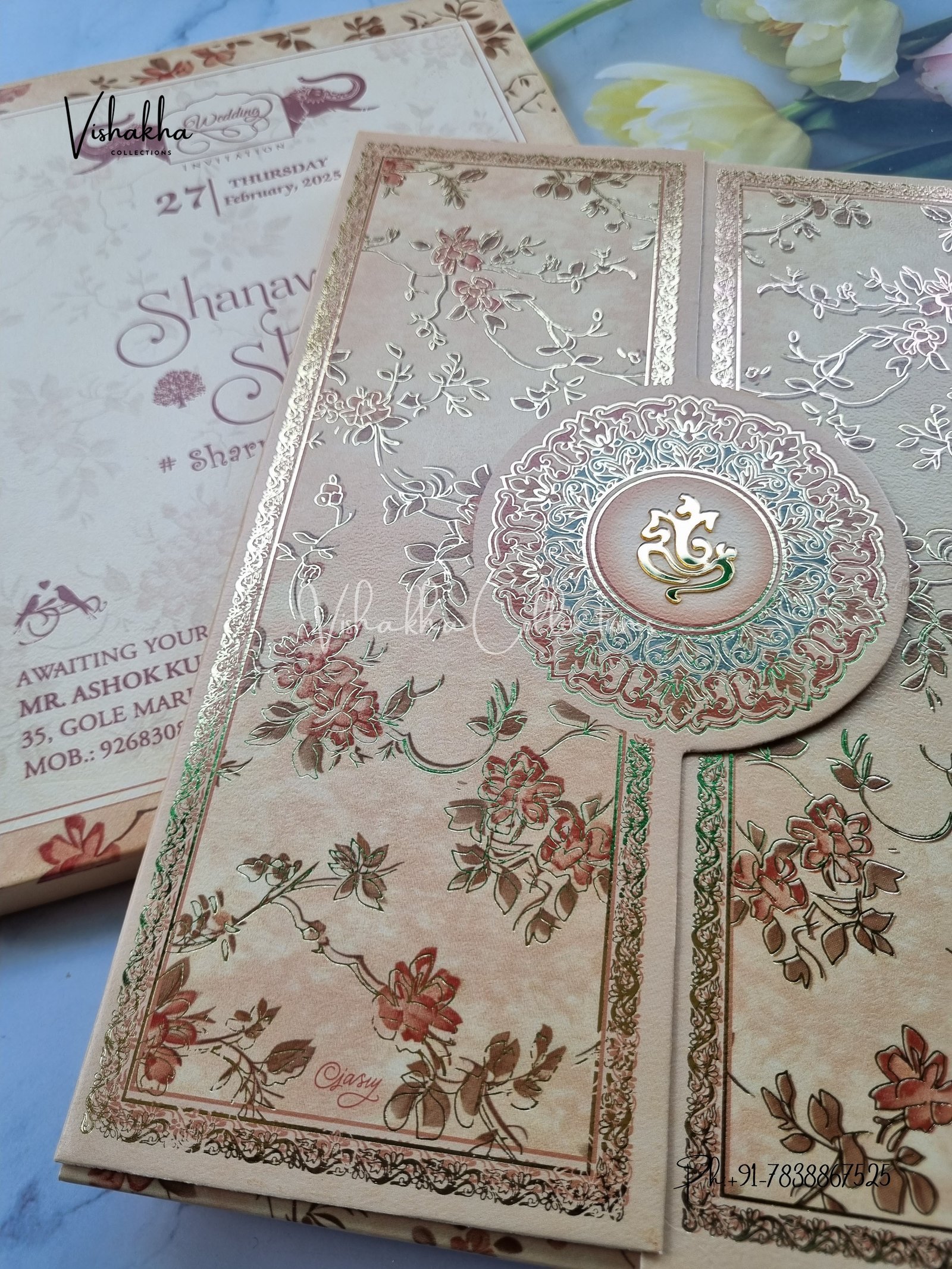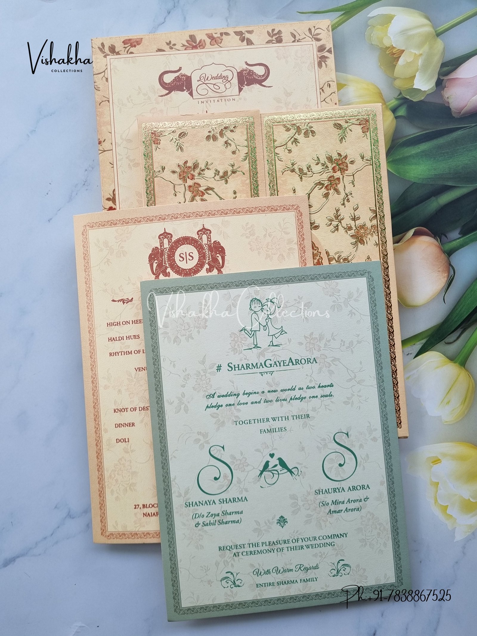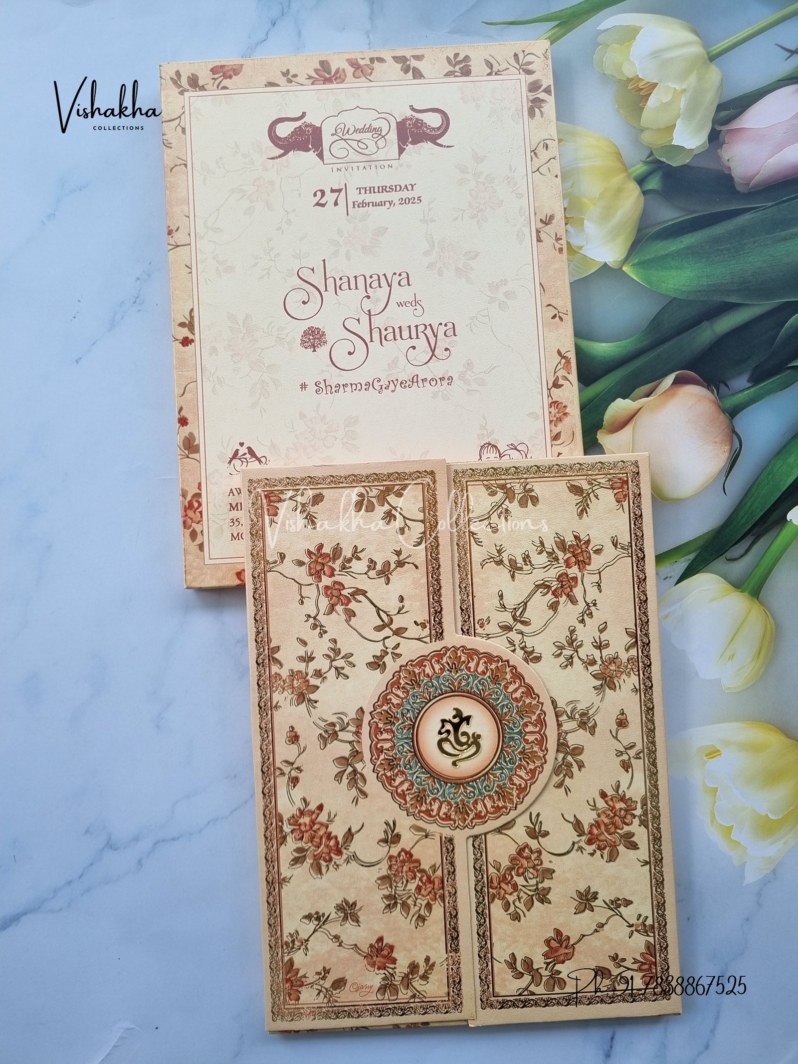 Vishakha Collections presents you beautiful luxury wedding invitation cards with all latest designs and the latest variety. Its just not a wedding invitation card but a beautiful feeling of love and relationship it carries for you. Beautifully printed and packed with a bundle of love. if you like it, dont think again, just go for it.If you are worrying about the quality of the product, send your doubts to us. We are here to help you. If you want in wholesale or bulk, dont forget to contact us.