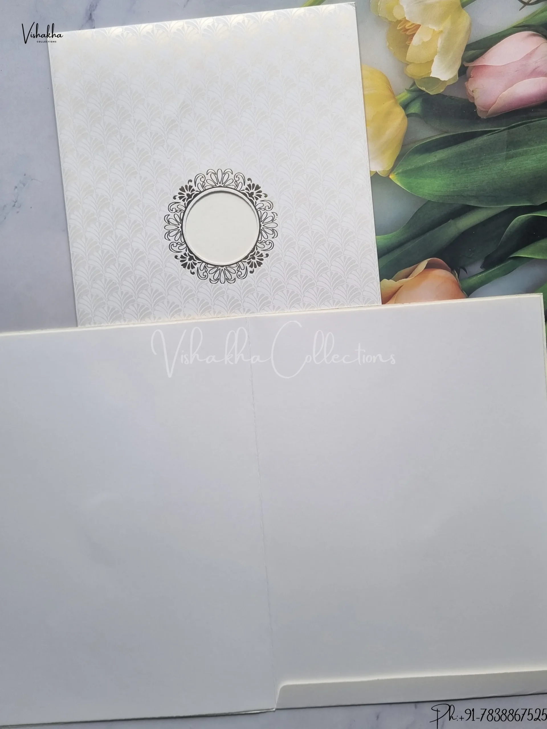 Vishakha Collections presents you beautiful luxury wedding invitation cards with all latest designs and the latest variety. Its just not a wedding invitation card but a beautiful feeling of love and relationship it carries for you. Beautifully printed and packed with a bundle of love. if you like it, dont think again, just go for it.If you are worrying about the quality of the product, send your doubts to us. We are here to help you. If you want in wholesale or bulk, dont forget to contact us.